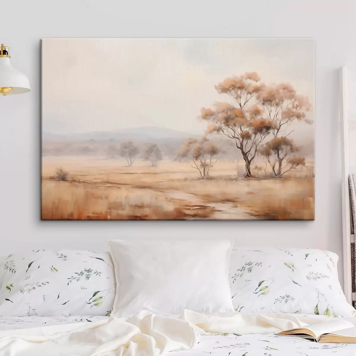 Wandbilder Ein Feld mit orangefarbenem Gras und einige Bäume mit orangefarbenen Blättern, Berge im Hintergrund mit einem bewölkten Himmel Art. s44927