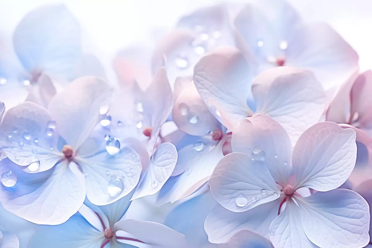 Wandbilder Hortensienblüten mit Wassertropfen auf den zarten Blütenblättern, sanfte Pastellfarben, hellblaue und rosa Töne s44929