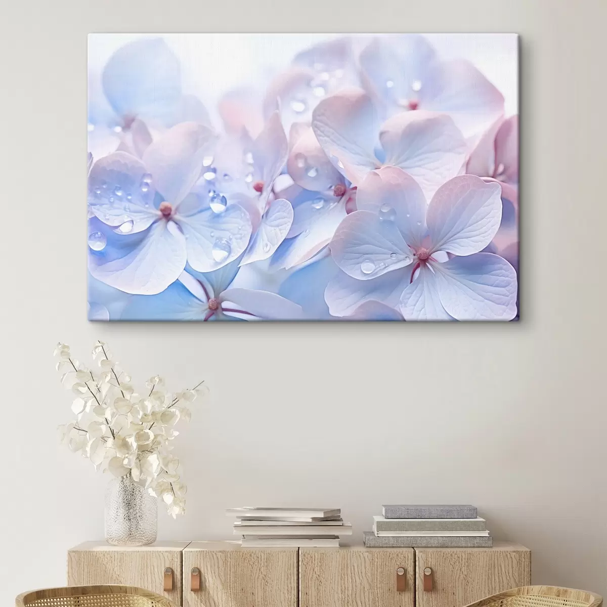 Wandbilder Hortensienblüten mit Wassertropfen auf den zarten Blütenblättern, sanfte Pastellfarben, hellblaue und rosa Töne Art. s44929