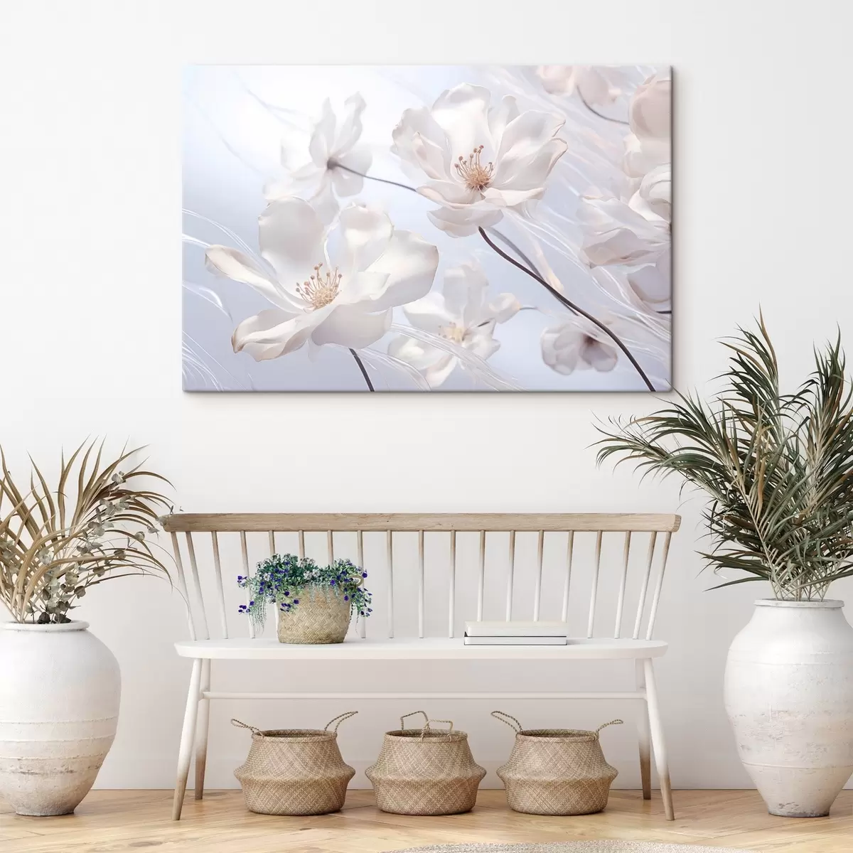 Wandbilder Weiße Blumen mit durchscheinenden Blütenblättern, weicher hellblauer Hintergrund, elegant, romantisch, zart, verträumt Art. s44931