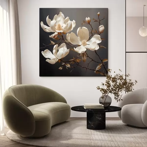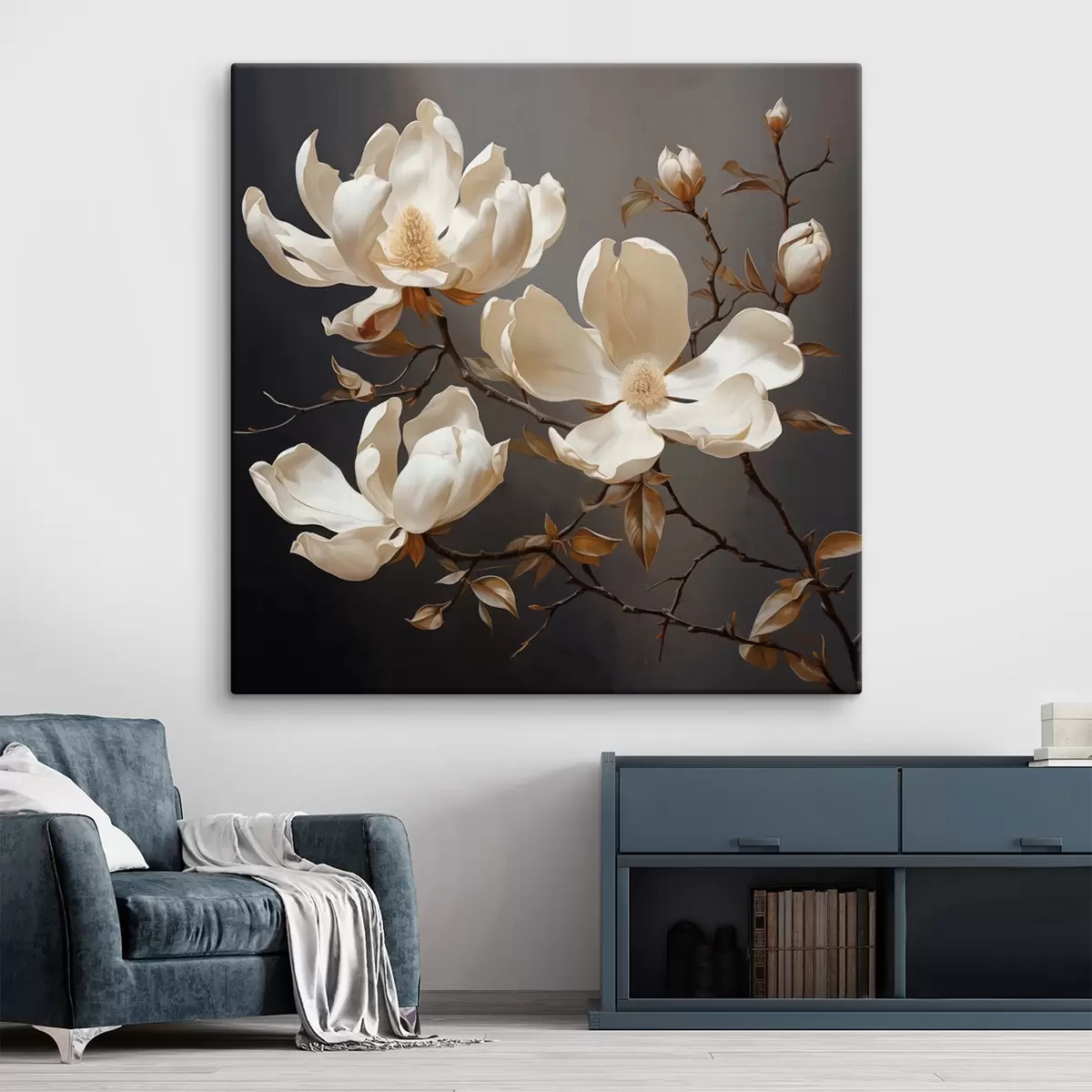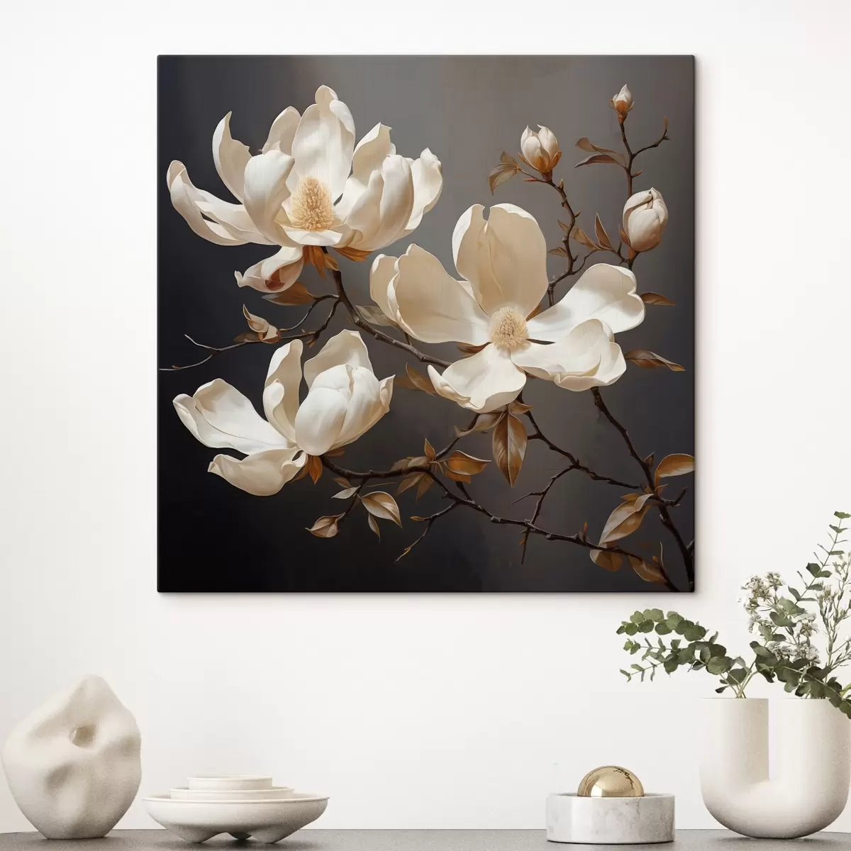 Wandbilder Weiße Magnolien auf dunklem Hintergrund im malerischen Stil Art. s45038