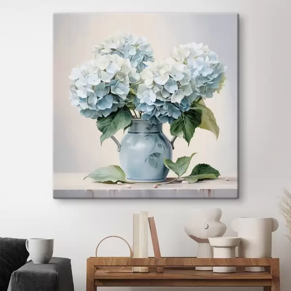 Wandbilder Frische Hortensien in einer blauen Vase auf hellem Hintergrund Art. s45043
