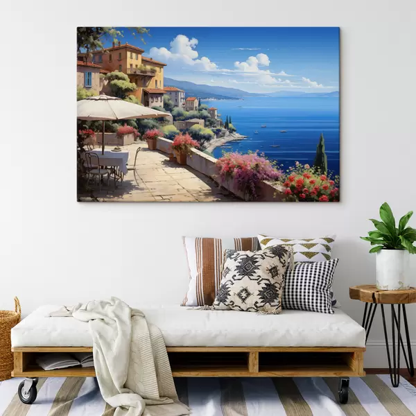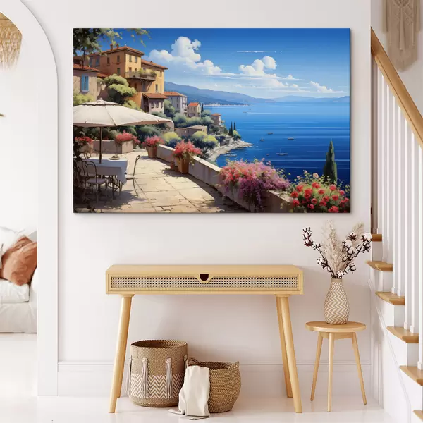 Wandbilder Mediterrane Landschaft mit blühender Terrasse im künstlerischen Stil s45053
