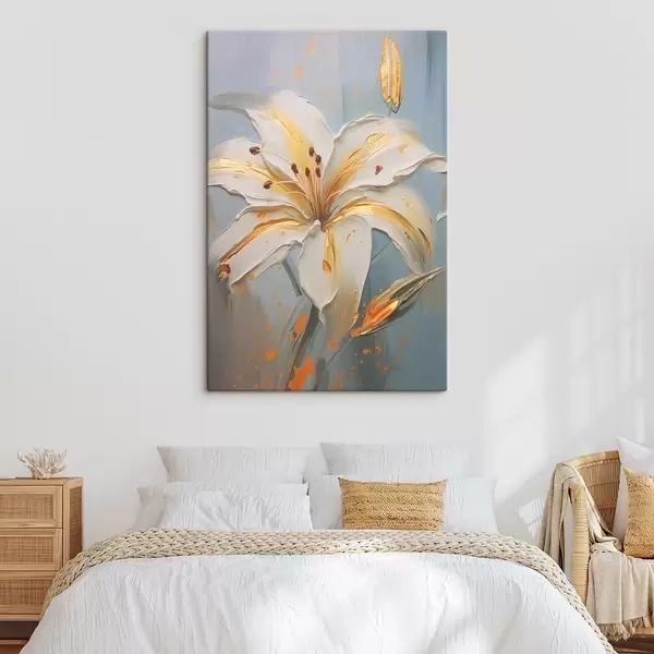 Wandbilder Weiße Lilie mit gelben Strichen auf blauem Hintergrund Art. s45077