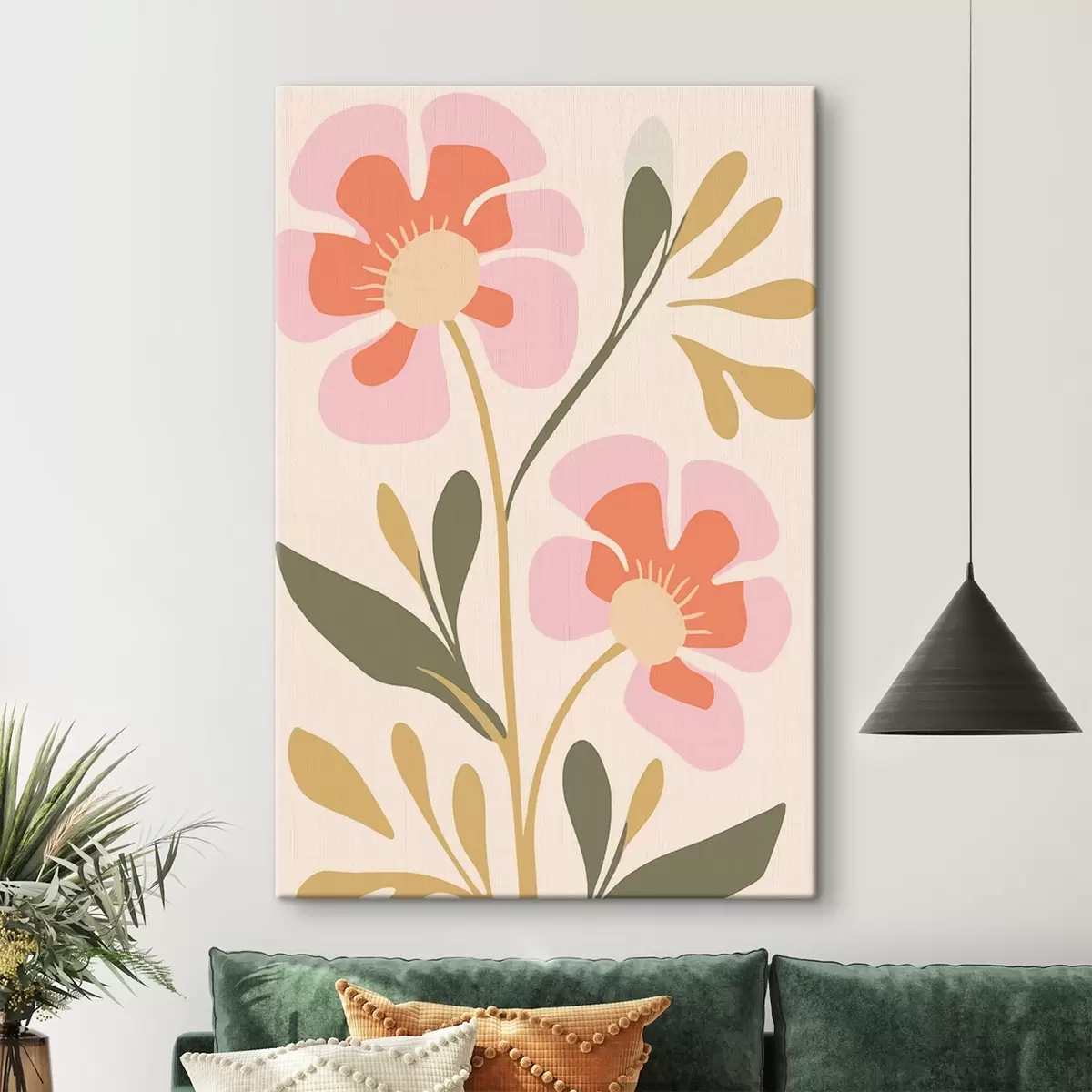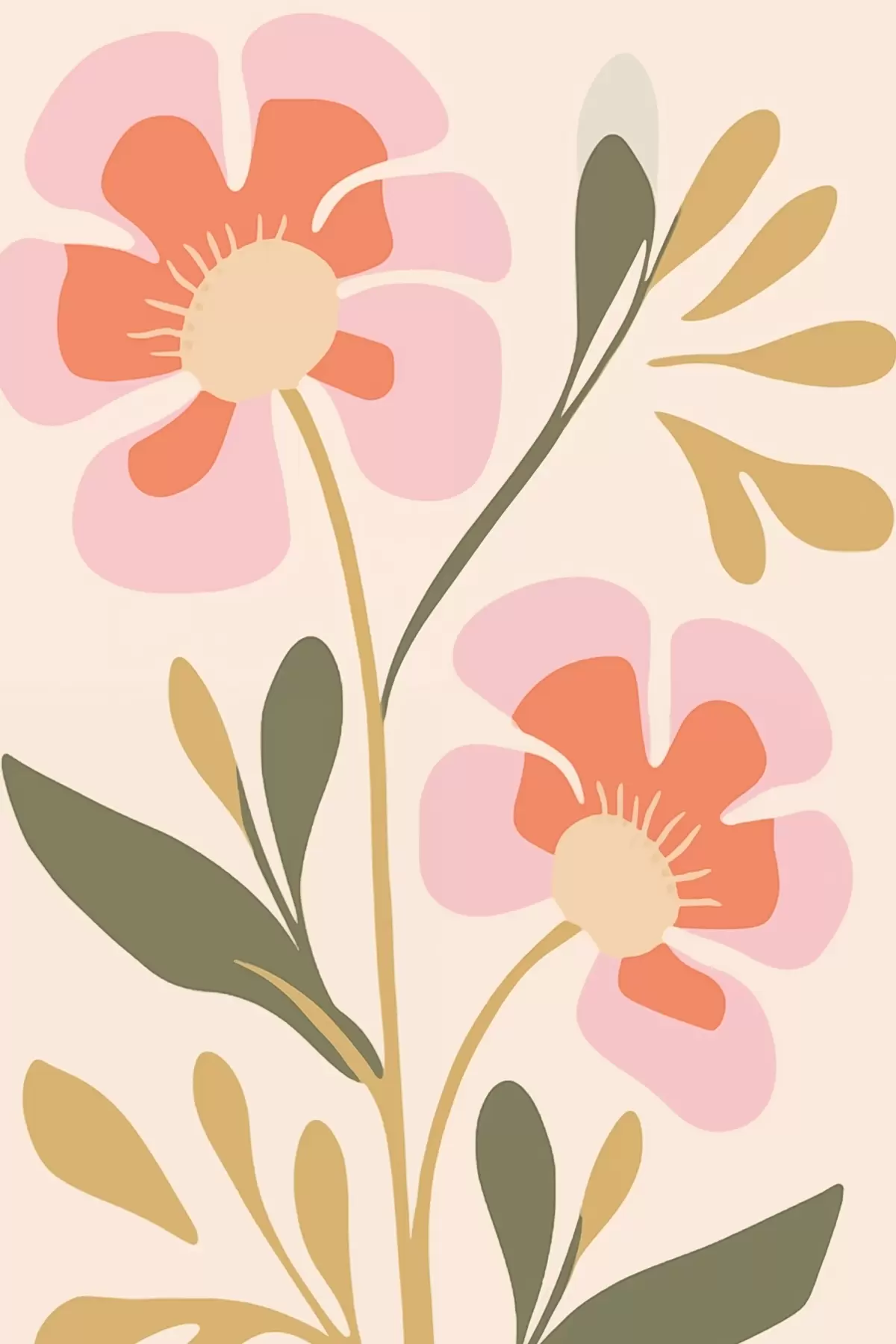 Wandbilder Stilisierte rosa und orange Blumen mit grünen Blättern Art. s45140