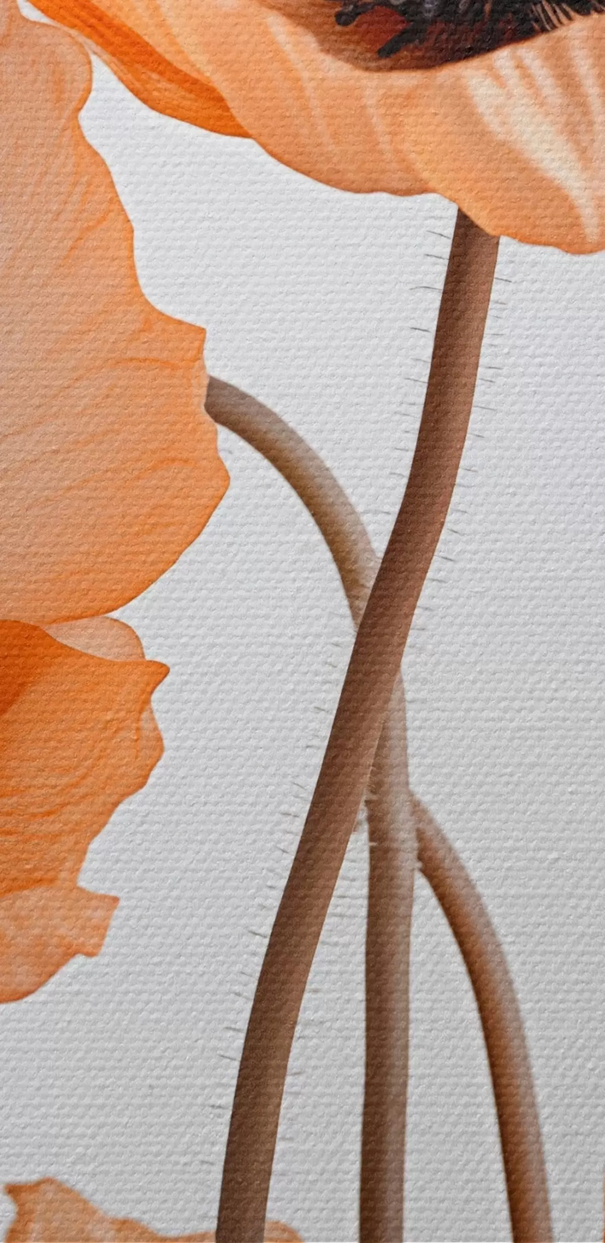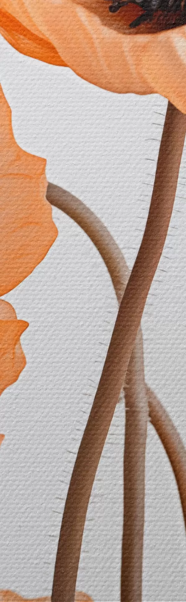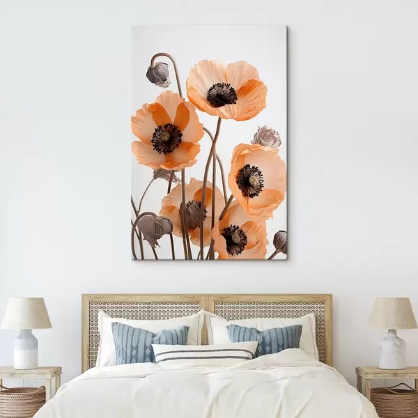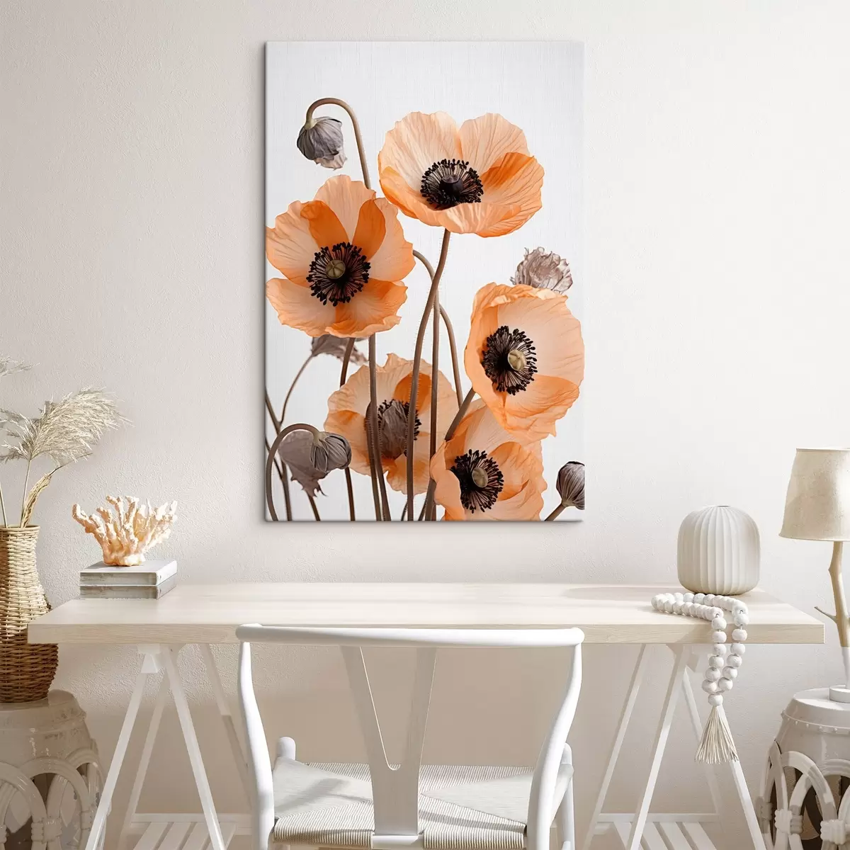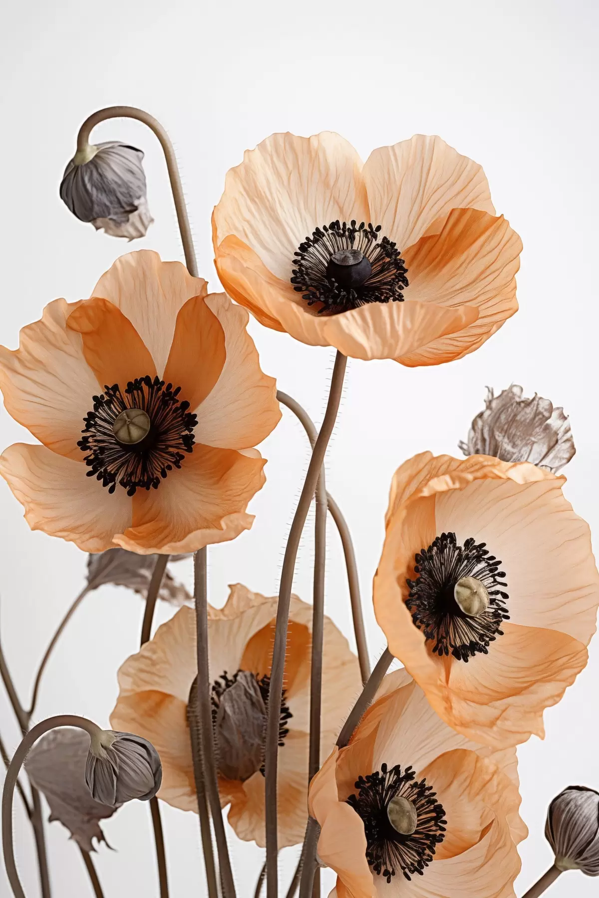 Wandbilder Orangefarbene Mohnblumen, getrocknete Blumen vor einem hellen Hintergrund, weiche Beleuchtung, zarte Blütenblätter, Blumenarrangement Art. s45167