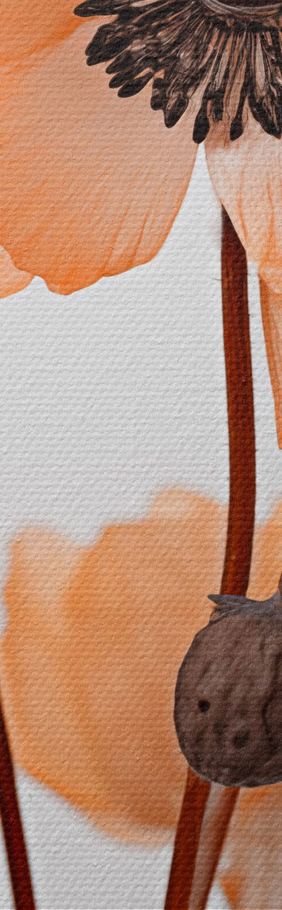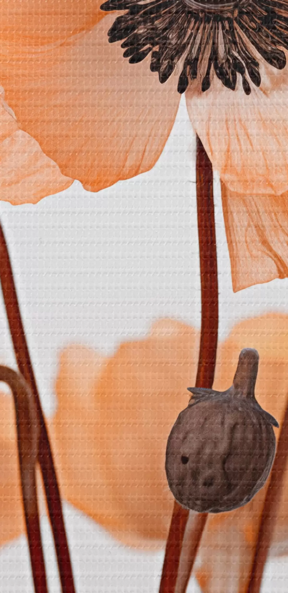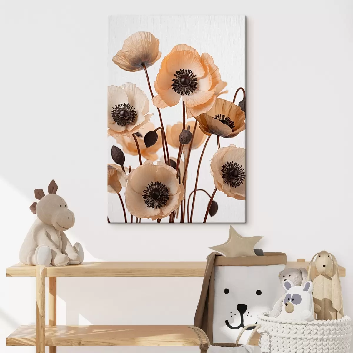 Wandbilder Orangefarbene Mohnblumen, getrocknete Blumen vor einem hellen Hintergrund, weiche Beleuchtung, zarte Blütenblätter, Blumenarrangement Art. s45168