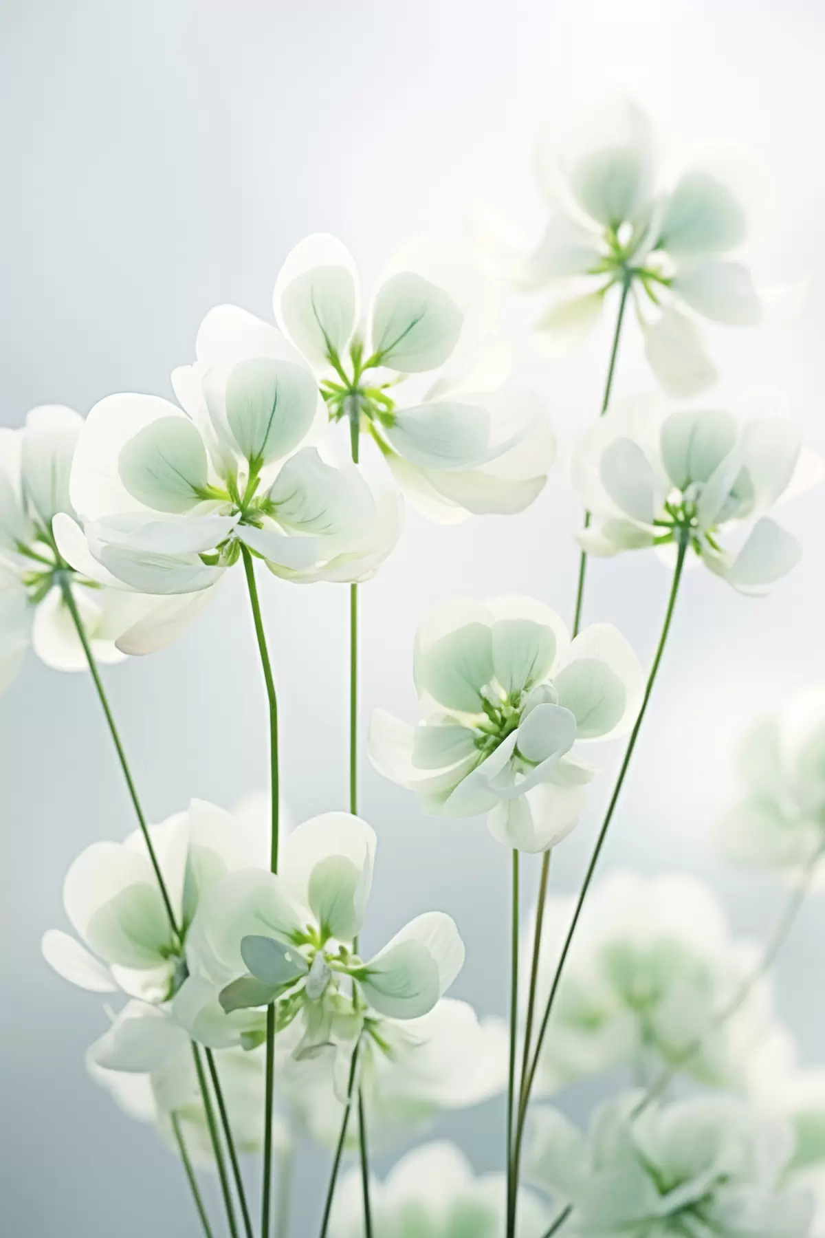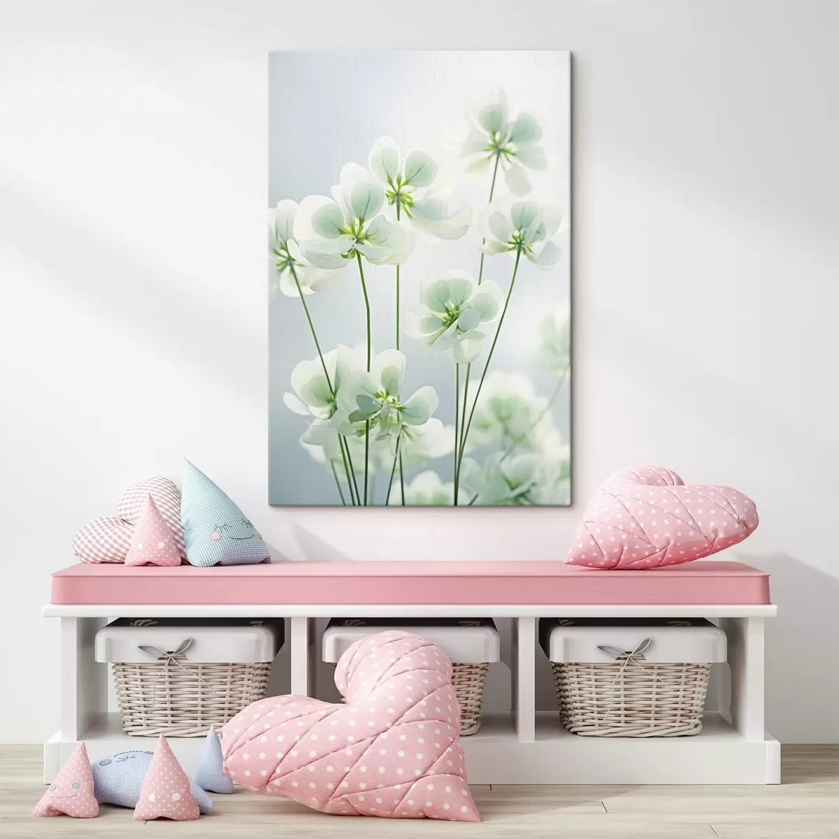 Wandbilder Weißer Klee Blumen mit grünen Stiel und Blätter, weiche Beleuchtung, sauberen Hintergrund, minimalistische Komposition, botanische s45172