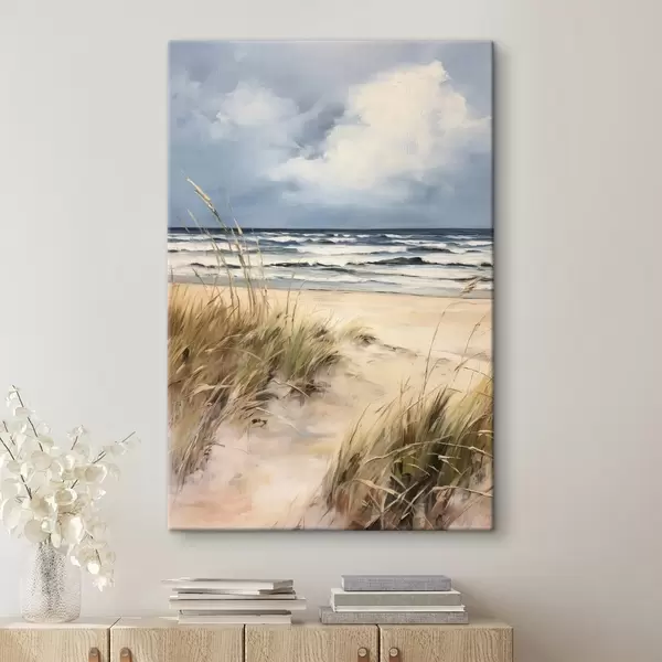 Wandbilder Ein Sandstrand mit hohem Gras im Vordergrund, das Meer mit Wellen und ein bewölkter Himmel im Hintergrund Art. s45173