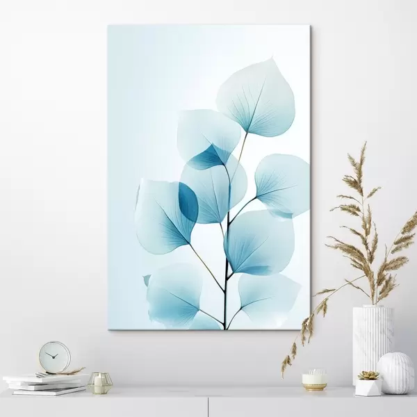 Wandbilder Zweig mit durchscheinenden blauen Blättern, zarte Adern sichtbar, leichte und ruhige Komposition, minimalistische Ästhetik s45175