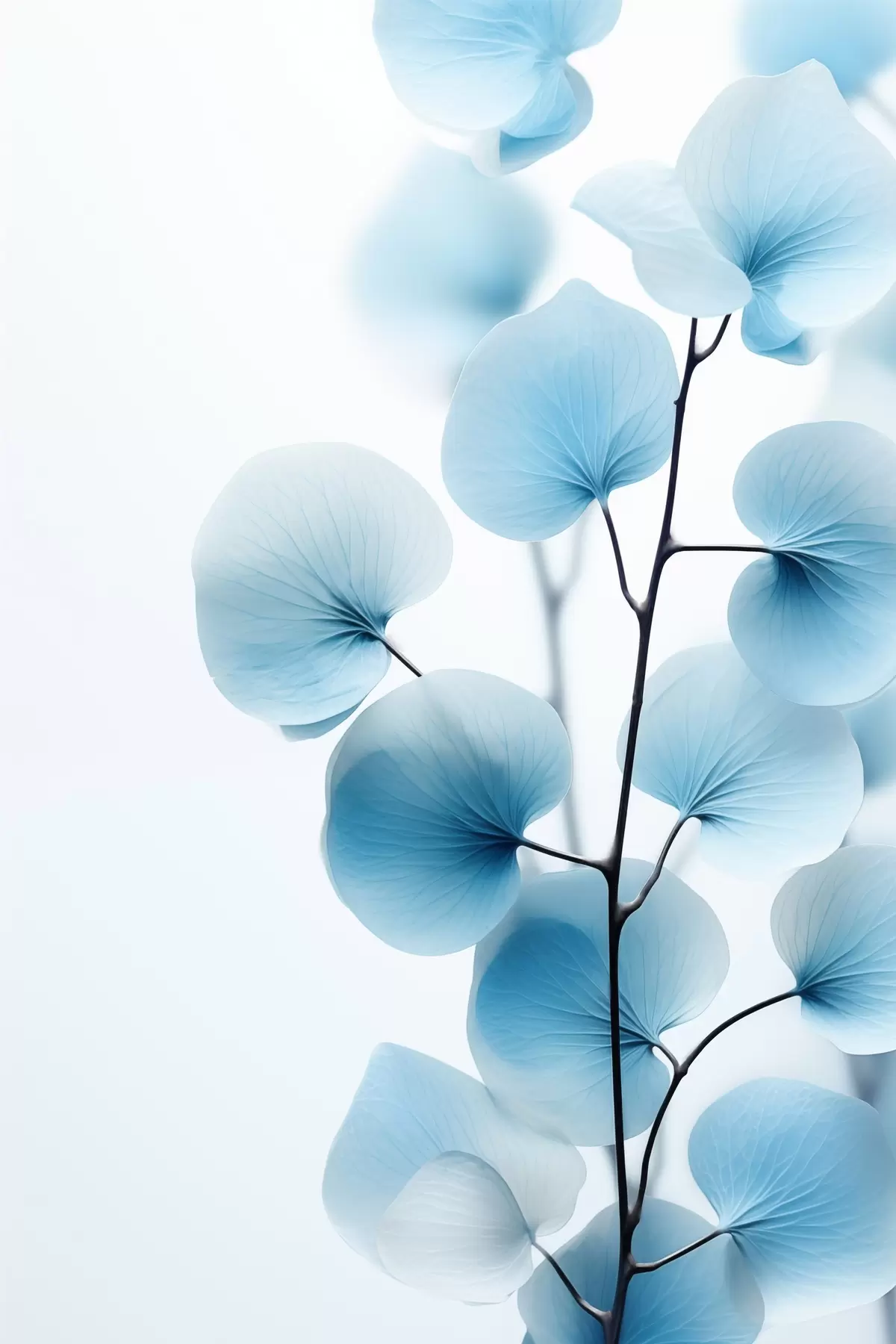 Wandbilder Zweig mit durchscheinenden blauen Blättern, zarte Adern sichtbar, leichte und ruhige Komposition, minimalistische Ästhetik s45176