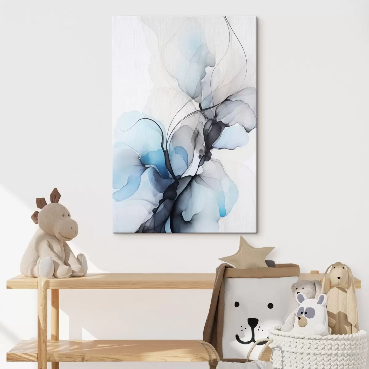 Wandbilder Abstrakte Komposition mit fließenden Linien und durchscheinenden Blütenblättern in blauen, weißen und beigen Farbtönen, Alkoholtintenimitation Art. s45177