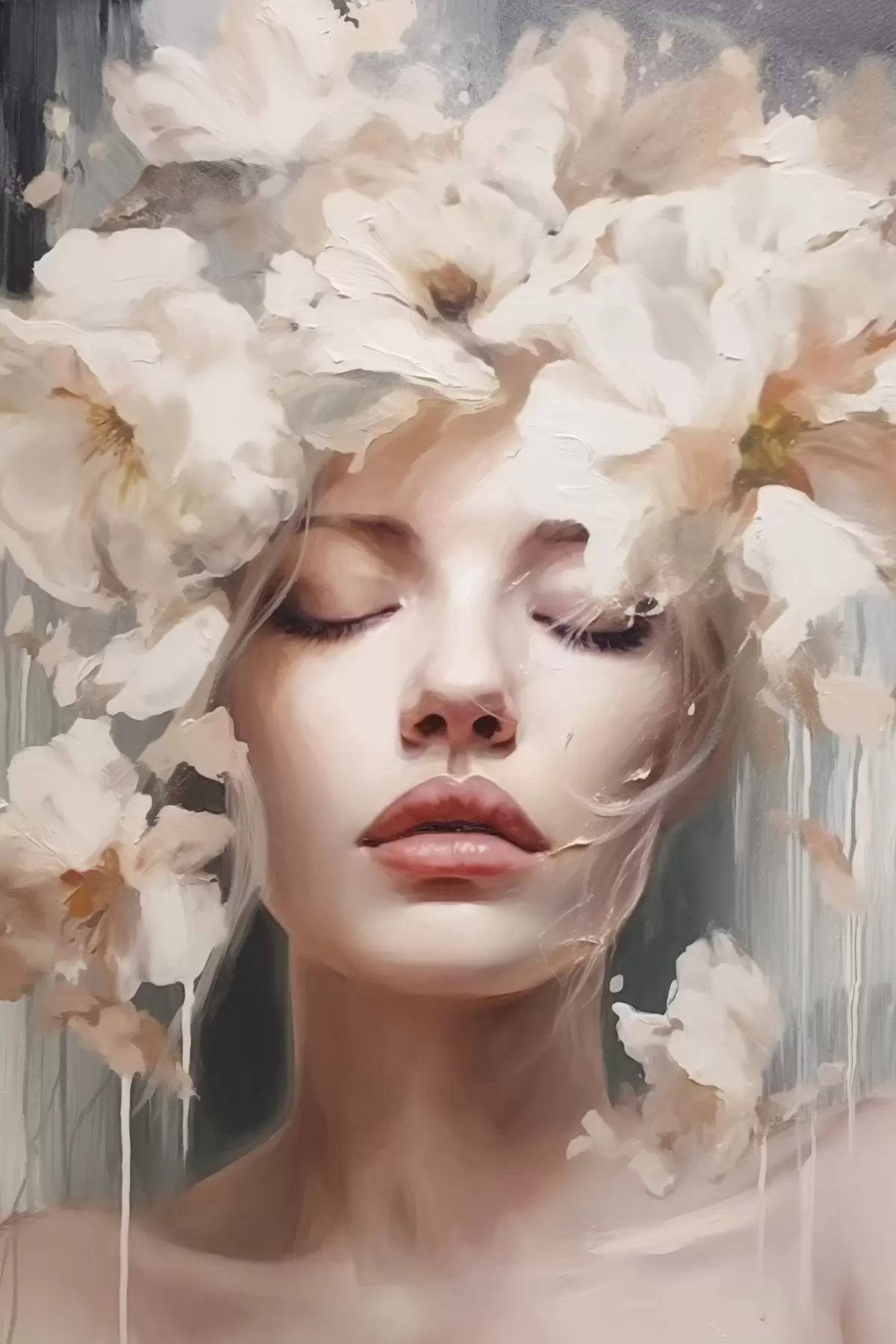 Wandbilder Weibliches Porträt mit weißen Blumen Art. s45218