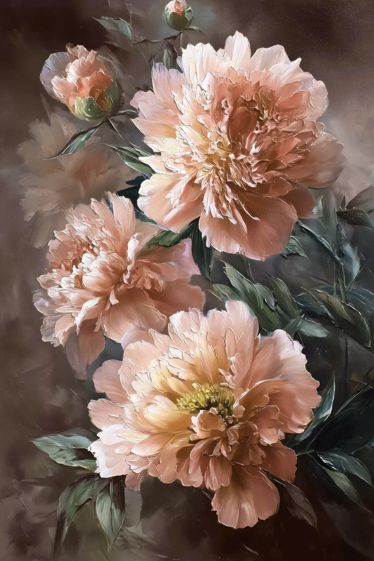 Wandbilder Blumenstrauß aus rosa Pfingstrosen mit fetten Strichen auf dunklem Hintergrund s45260