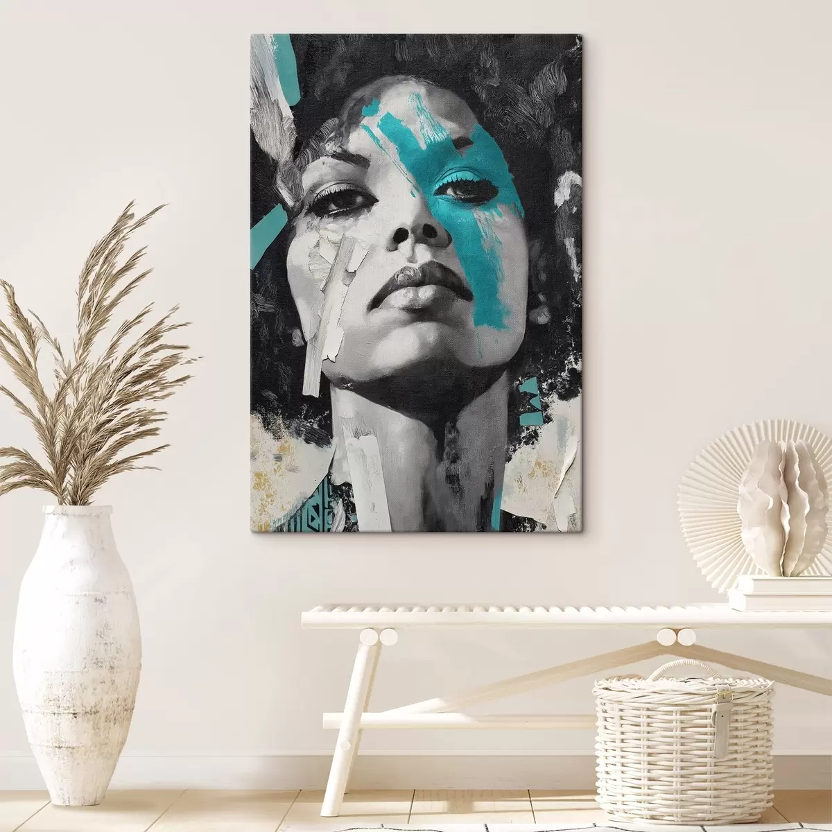 Wandbilder Mixed Media Portrait mit Fragmenten von Farbstrichen und Texturen Art. s45416