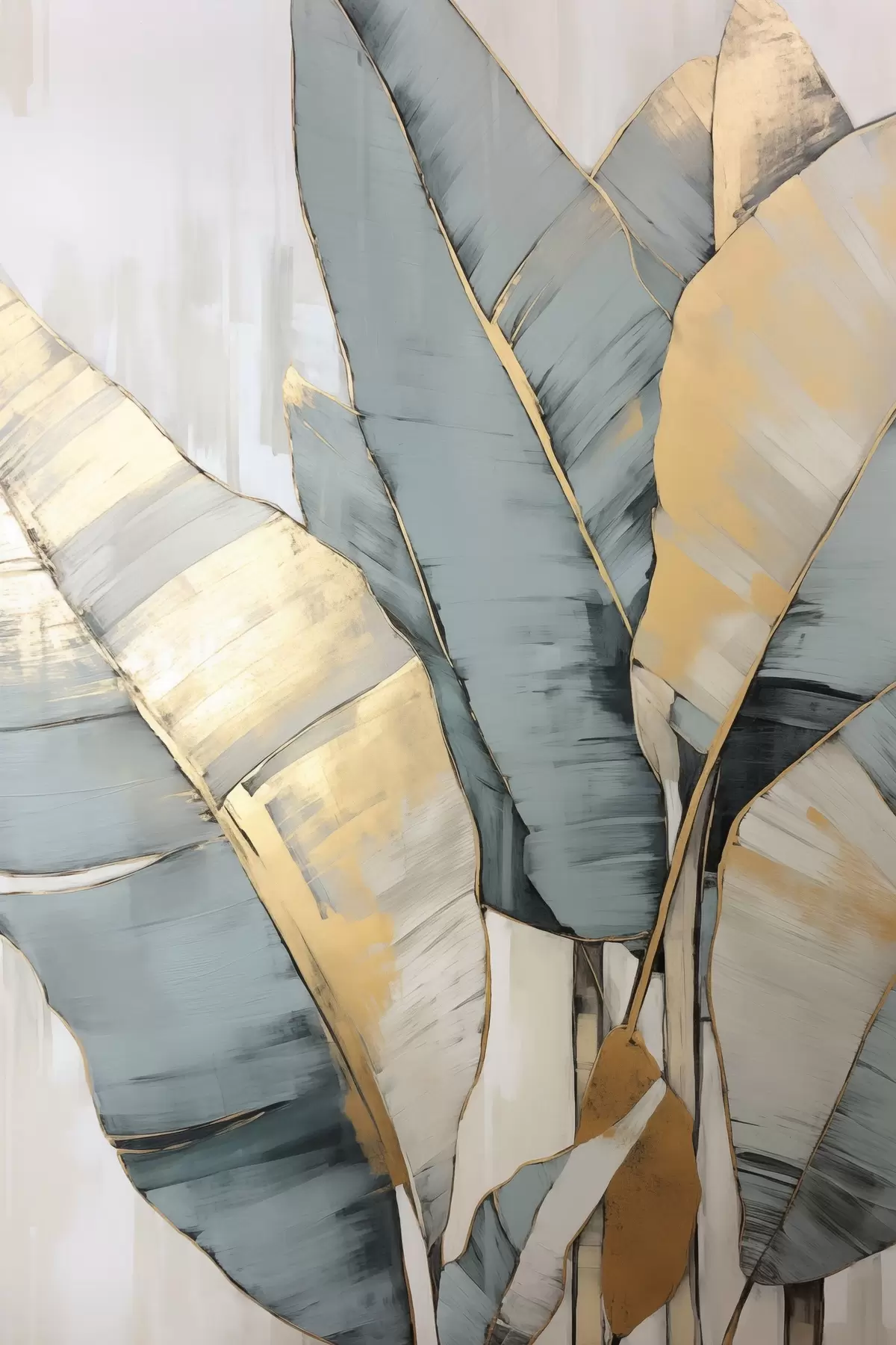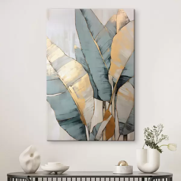 Wandbilder Gedämpfte blaue, graue und gelbe Bananenblätter mit sichtbaren Pinselstrichen vor einem weißen abstrakten Hintergrund Art. s45552
