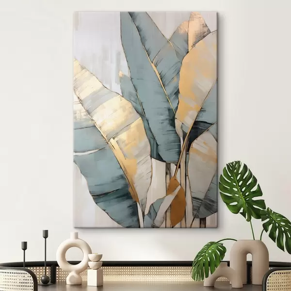 Wandbilder Gedämpfte blaue, graue und gelbe Bananenblätter mit sichtbaren Pinselstrichen vor einem weißen abstrakten Hintergrund Art. s45552