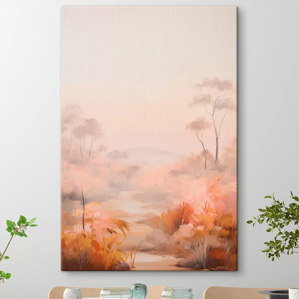 Wandbilder Eine Landschaft mit Sträuchern und Bäumen in Rosa-, Orange- und Brauntönen, mit Bergen im Hintergrund Art. s45553