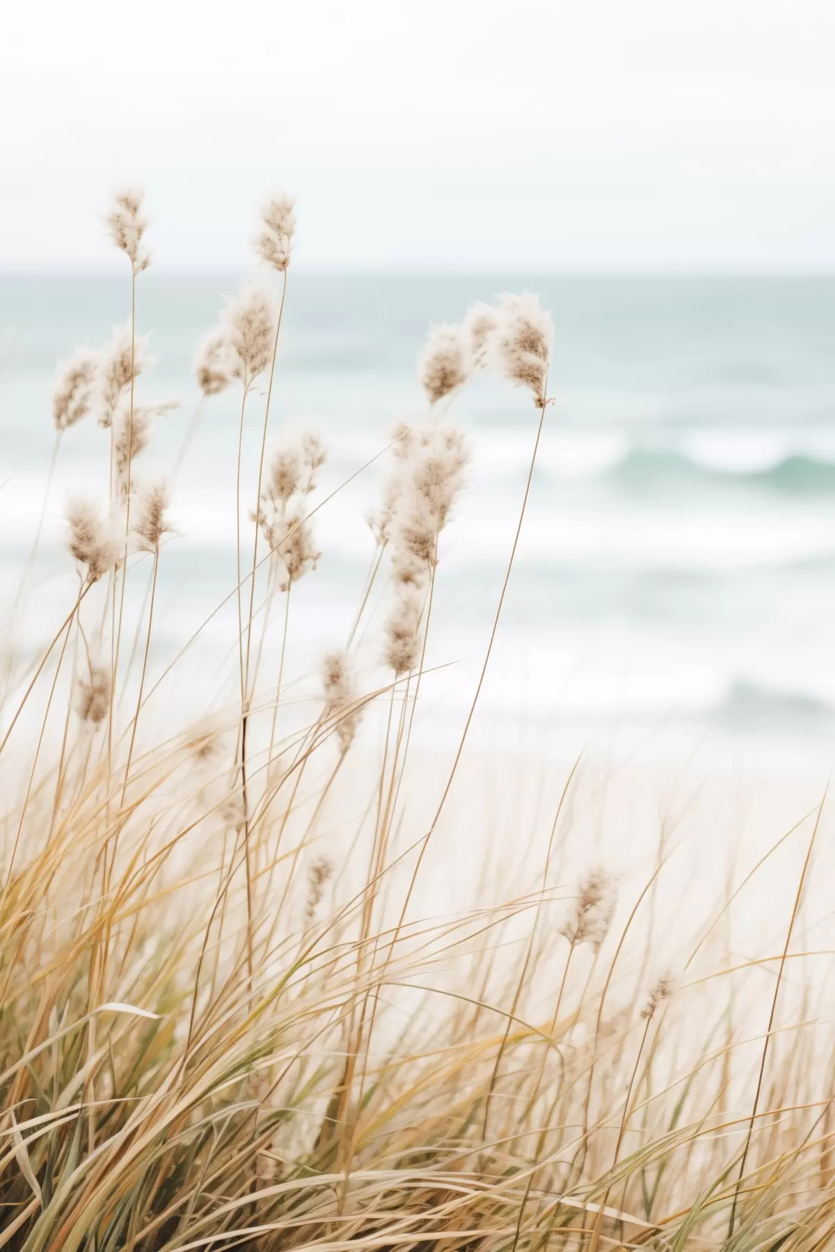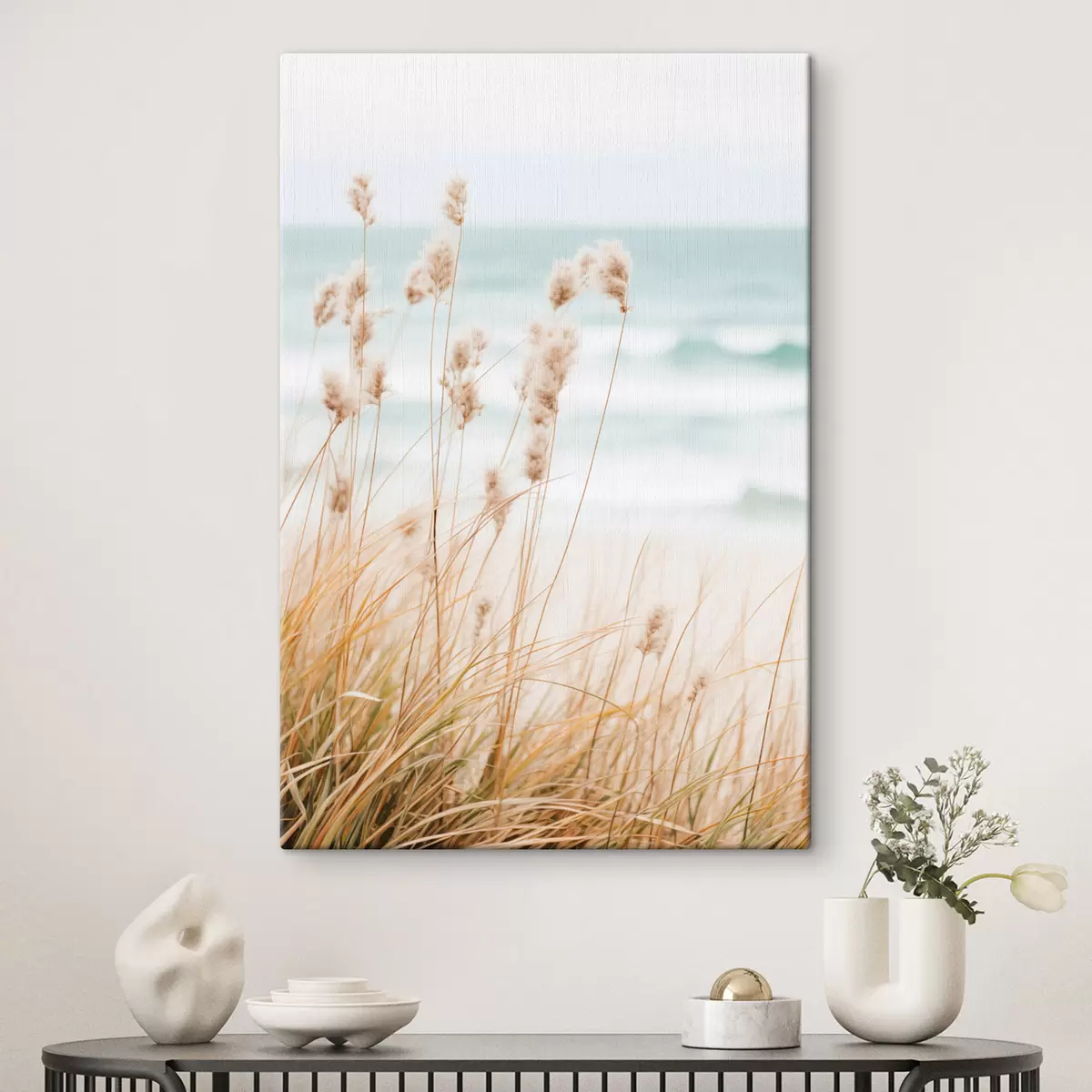 Wandbilder Hohes Gras mit flauschigen Samenköpfen, Sandstrand und Meereswellen im Hintergrund, weiche und gedämpfte Farbpalette Art. s45561