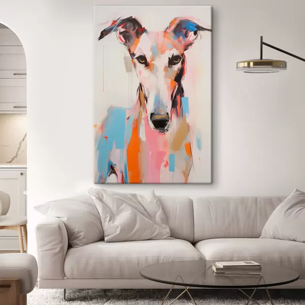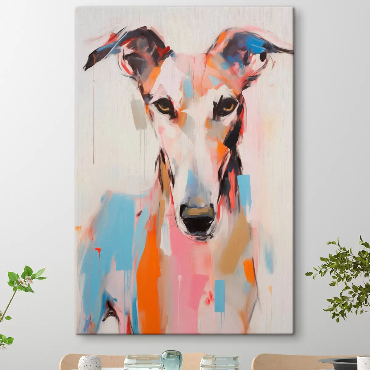 Wandbilder Ein Windhund, gemalt mit leuchtenden Farben wie Orange, Rosa und Blau, vor einem schlichten weißen Hintergrund Art. s45565