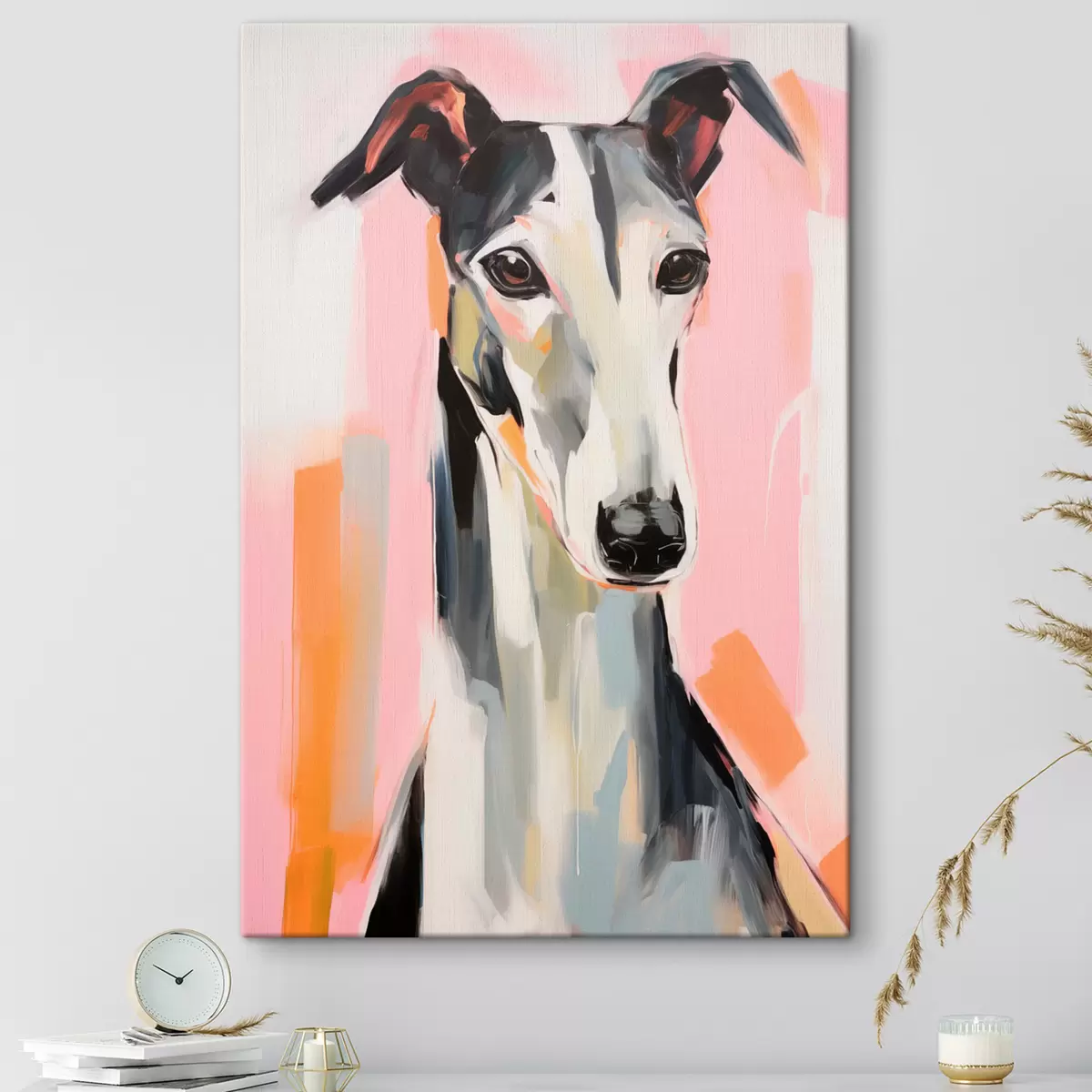 Wandbilder Ein Windhund vor einem Hintergrund aus rosa, orangefarbenen und weißen Pinselstrichen s45566