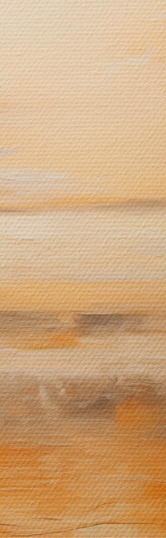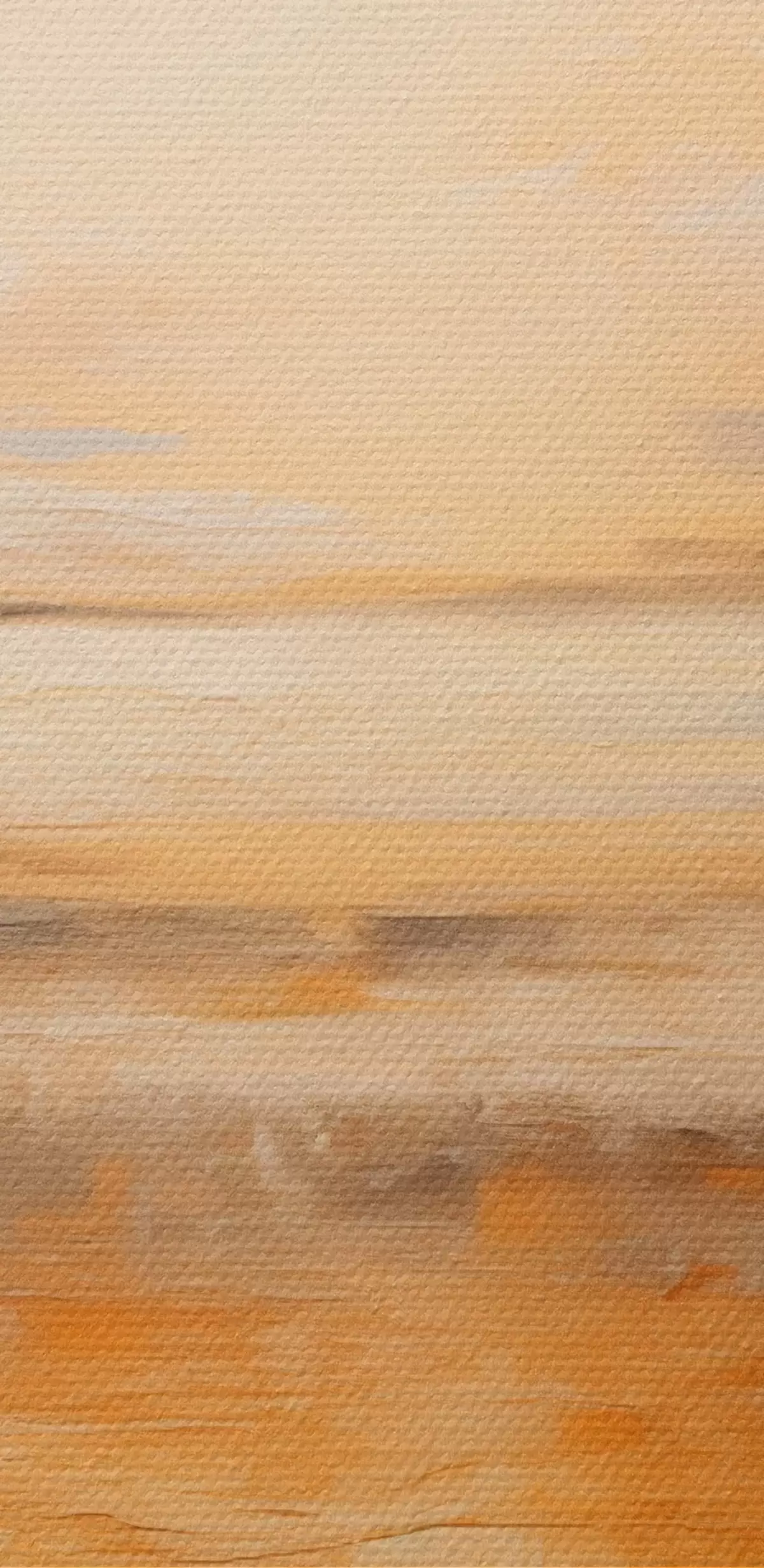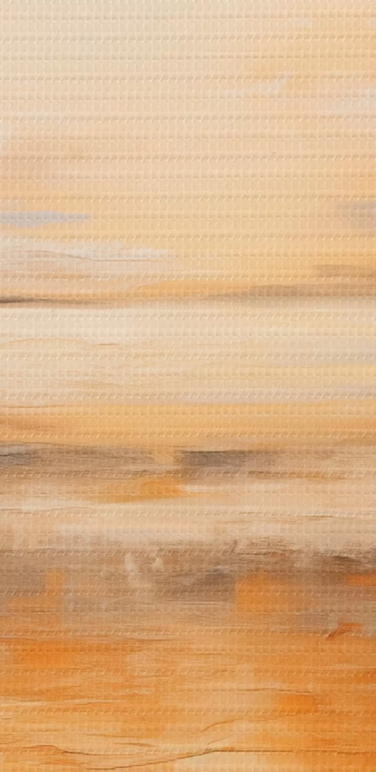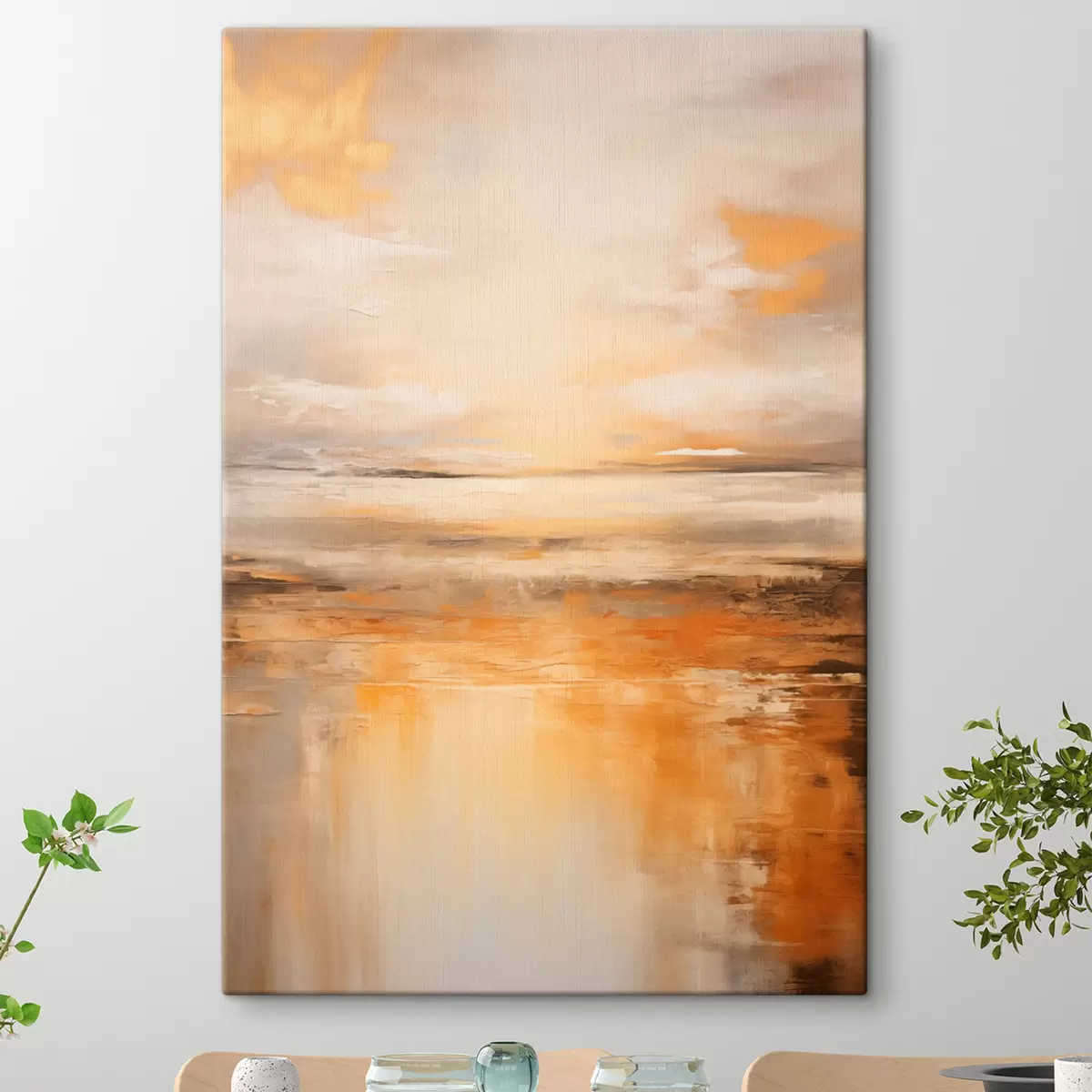 Wandbilder Ein abstraktes Gemälde von einer Strandlandschaft mit einem ruhigen Meer, orangefarbenem Sand und einem bewölkten Himmel mit Sonne s45567