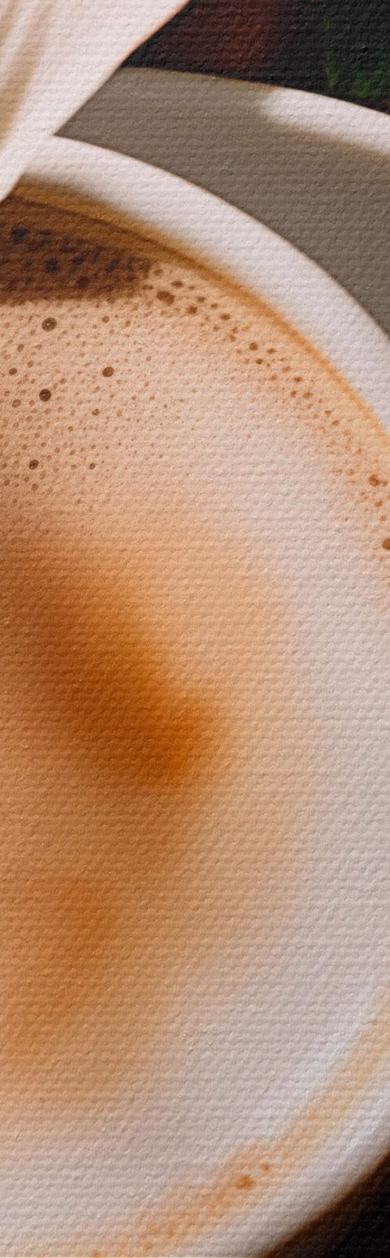 Wandbilder Eine Tasse Kaffee mit Schaum auf einem weißen Teller, einige Blumen im Hintergrund, mit Sonnenlicht s45569