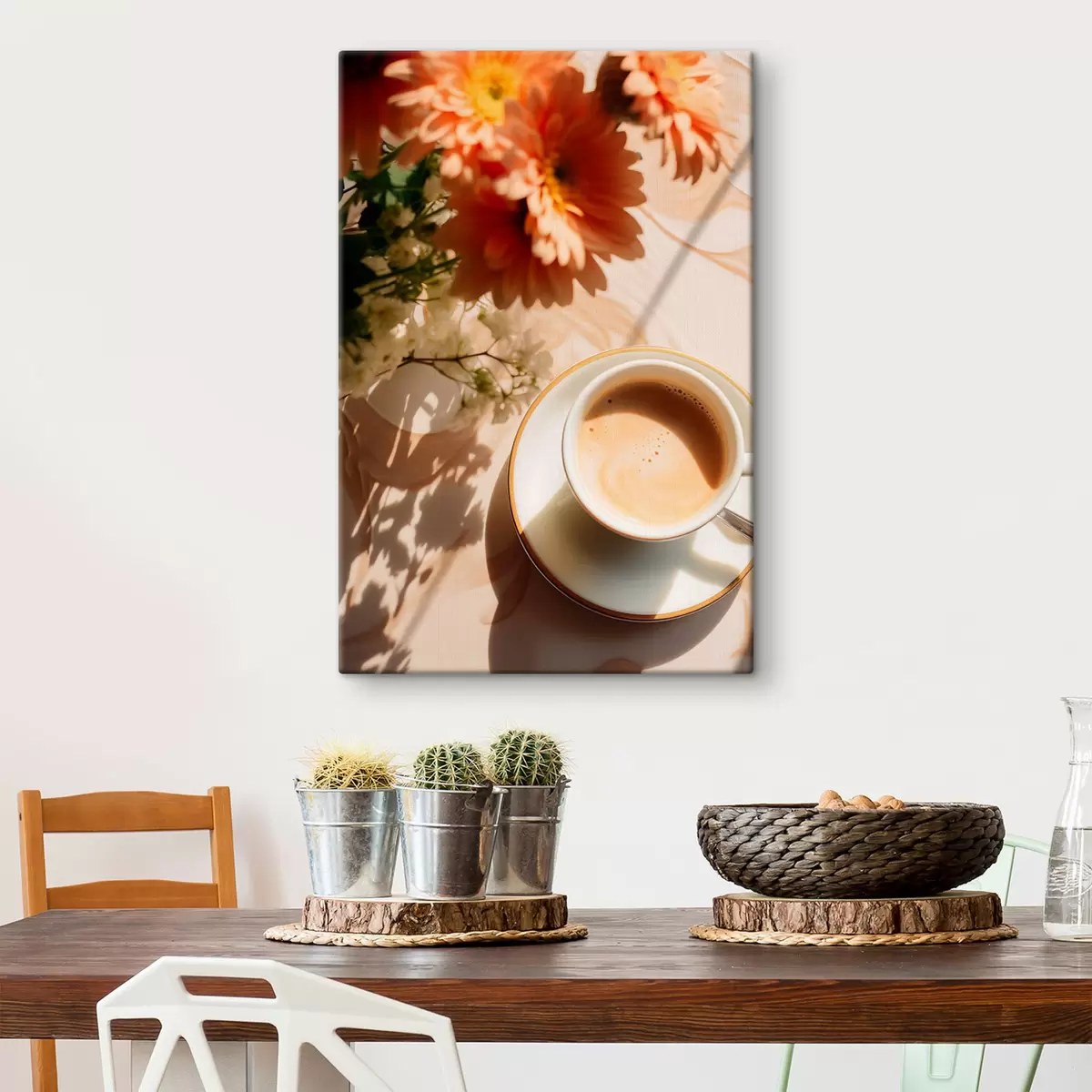 Wandbilder Eine Tasse Kaffee mit Schaum auf einem weißen Teller, einige Blumen im Hintergrund, mit Sonnenlicht Art. s45570