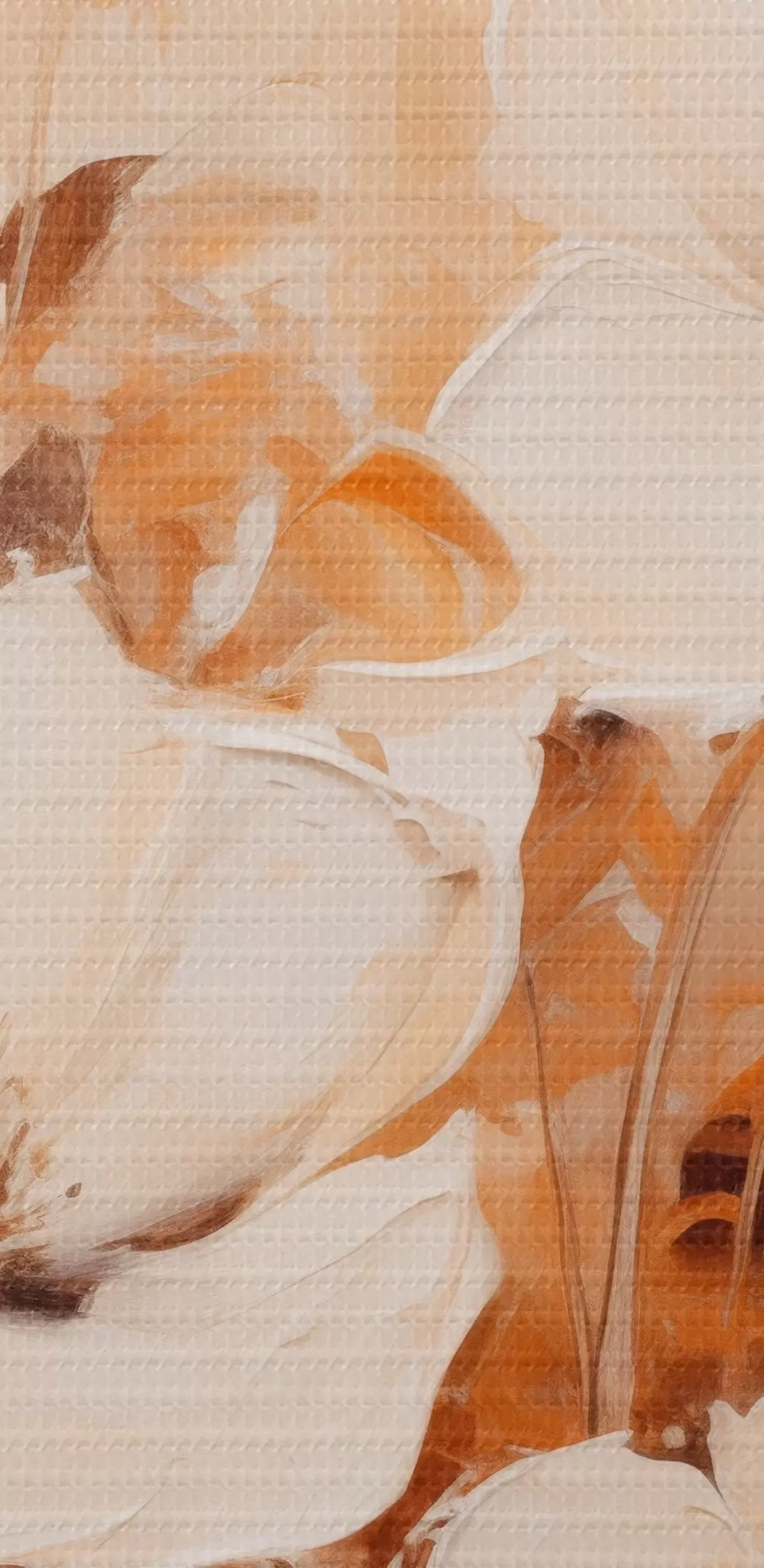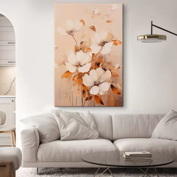 Wandbilder Weiße Blumen mit orangefarbenen Blättern, zarte Pinselstriche, warme Farbpalette, elegante Komposition Art. s45573