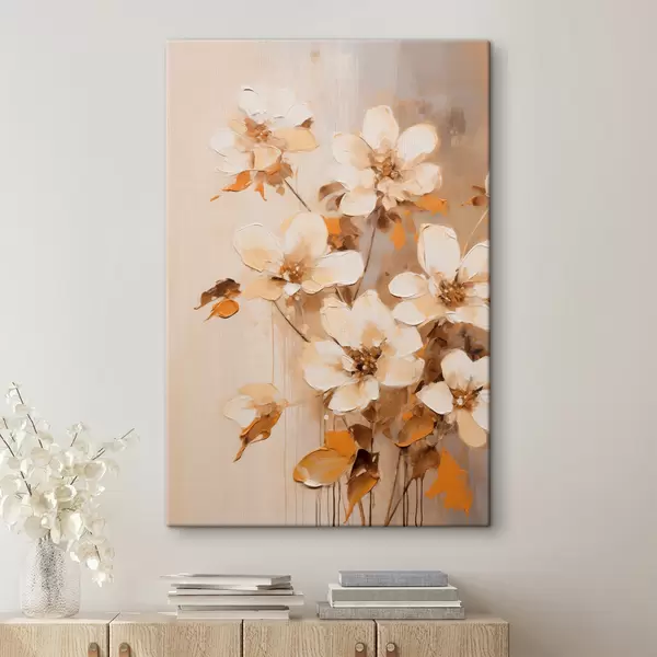 Wandbilder Weiße Blumen mit orangefarbenen Blättern, zarte Pinselstriche, Blumenarrangement, botanische Kunst Art. s45574
