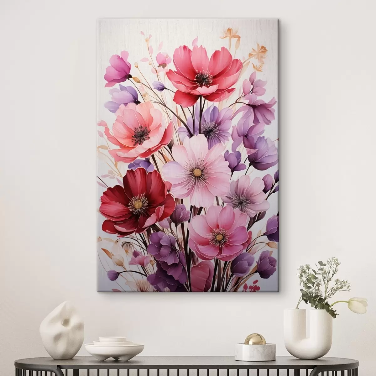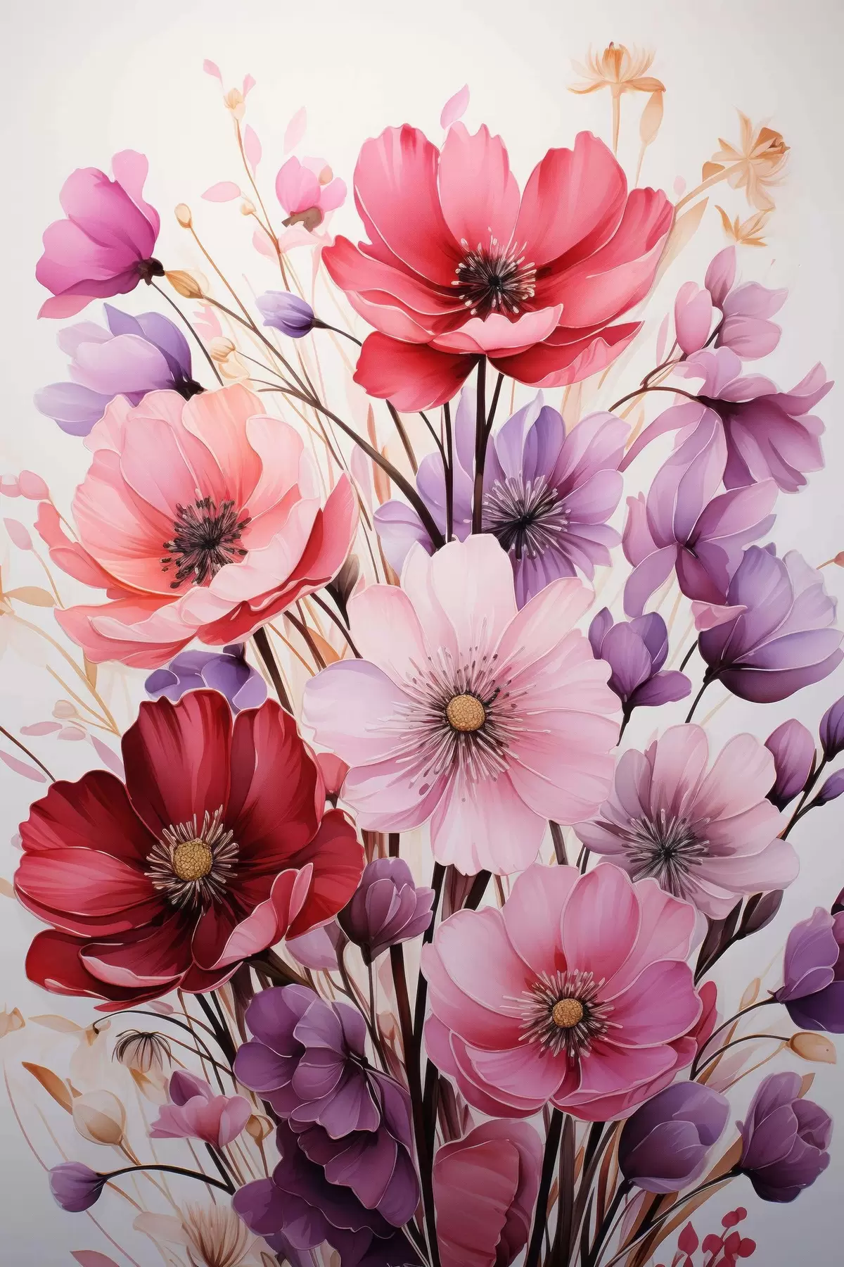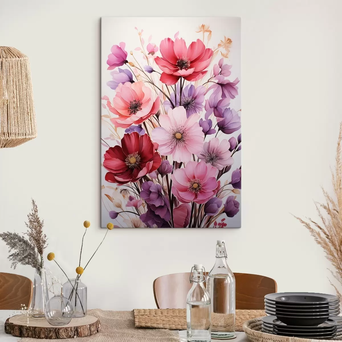Wandbilder Zarter Blumenstrauß aus rosa und lila Mohnblumen auf hellem Hintergrund, Aquarellstil s45601