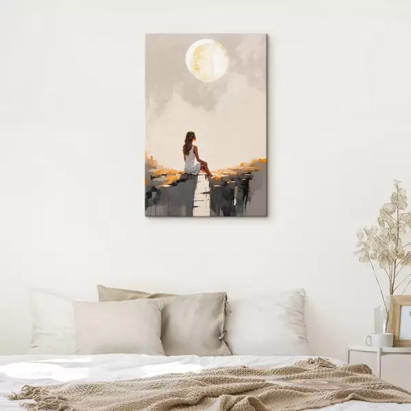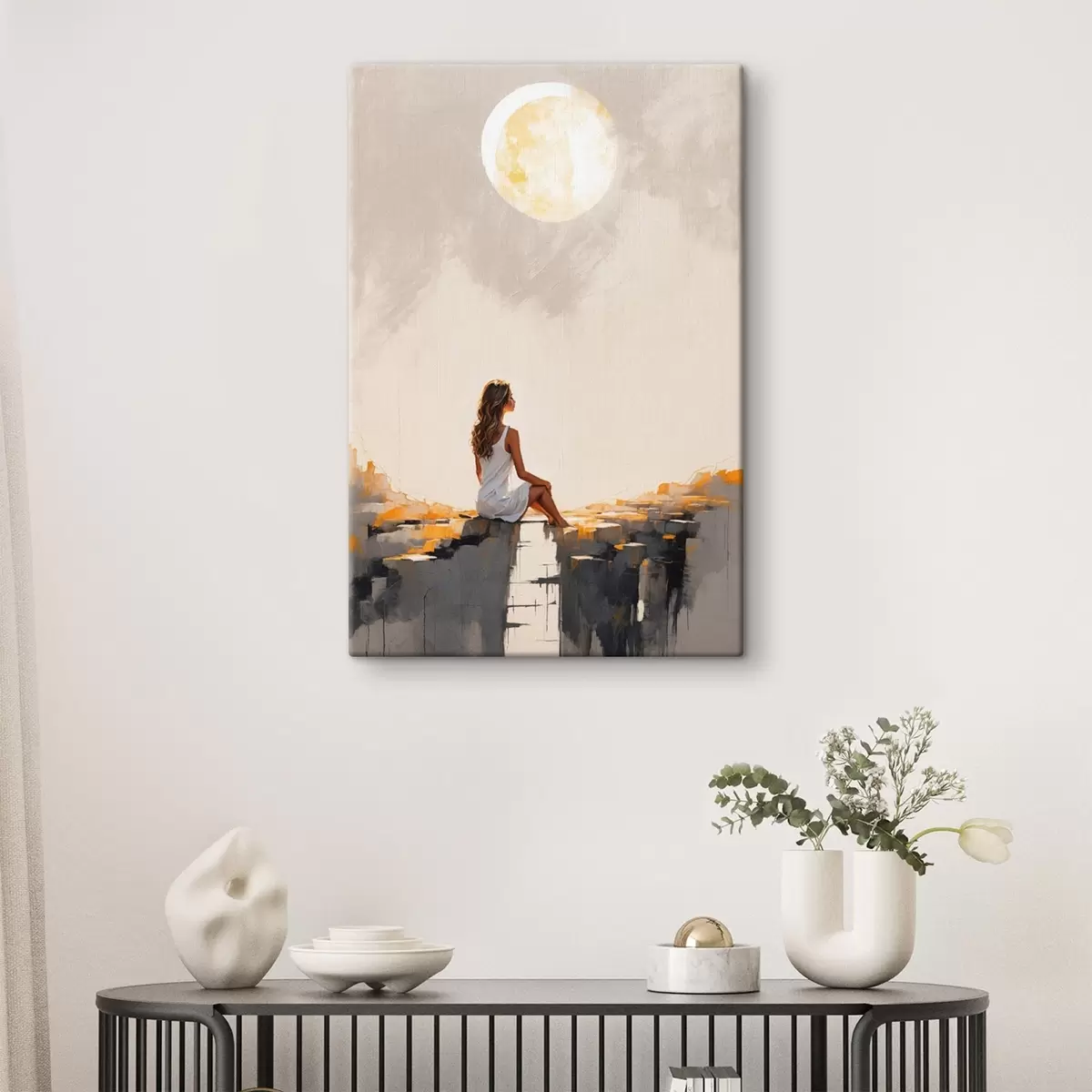 Wandbilder Mädchen im weißen Kleid sitzt unter einem großen Mond Art. s45621