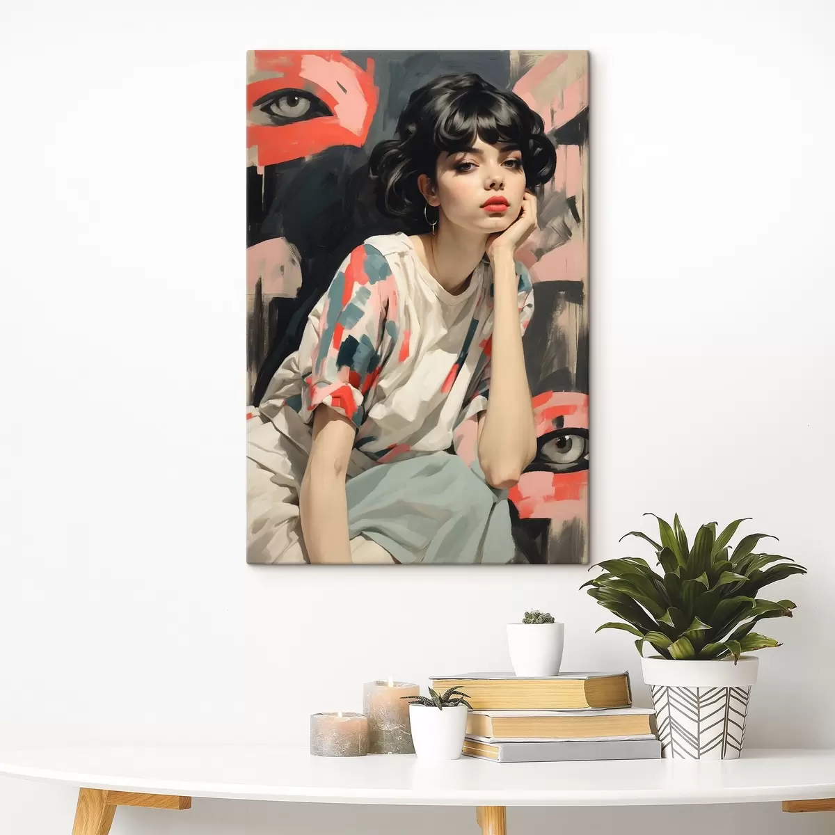 Wandbilder Porträt eines Mädchens vor einem Hintergrund mit Augen und abstrakten Strichen Art. s45623