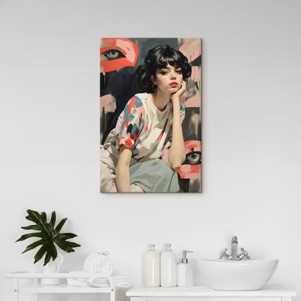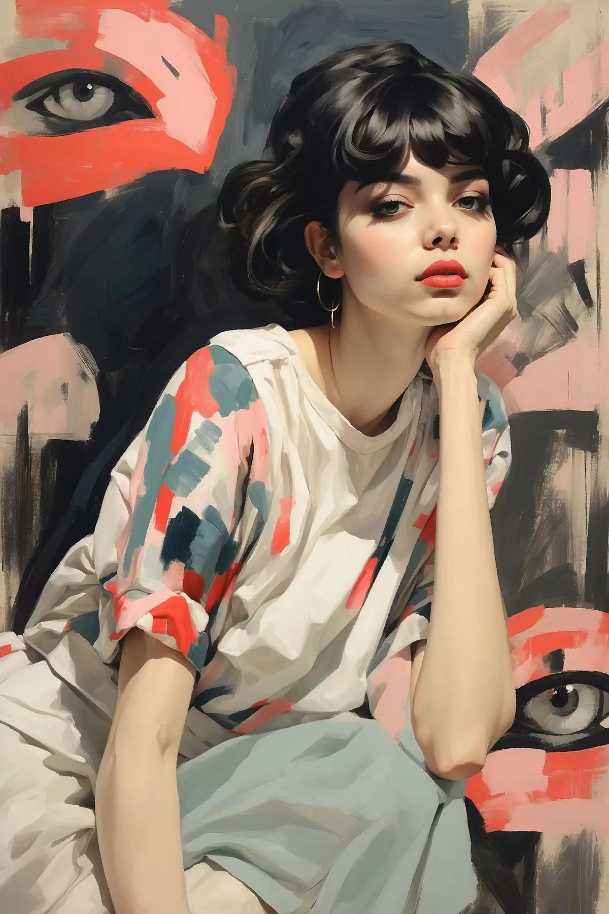 Wandbilder Porträt eines Mädchens vor einem Hintergrund mit Augen und abstrakten Strichen Art. s45623