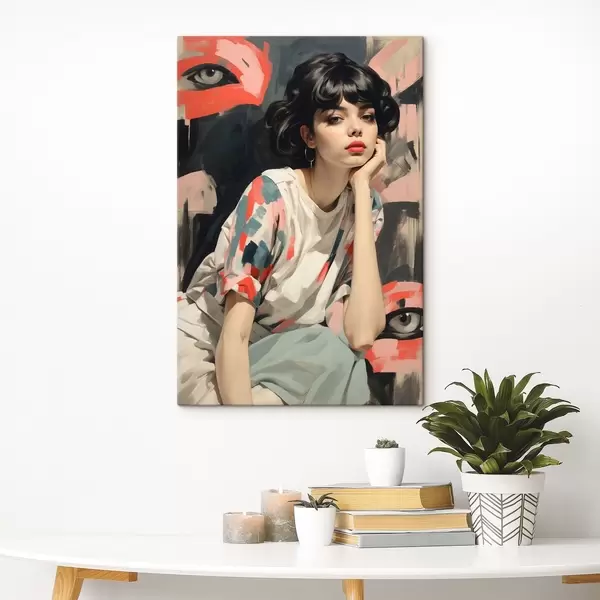 Wandbilder Porträt eines Mädchens vor einem Hintergrund mit Augen und abstrakten Strichen Art. s45623