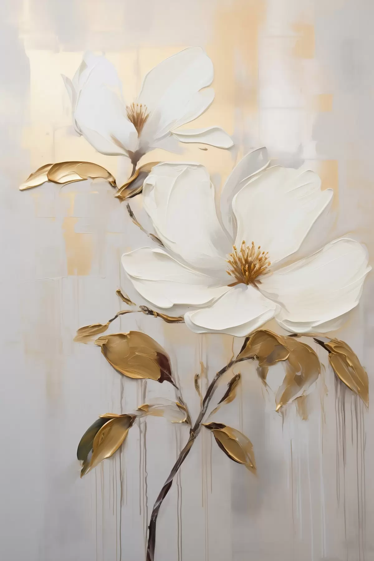 Wandbilder Zwei weiße Blüten mit gelb-orangefarbenen Blättern auf hellem Hintergrund Art. s45691