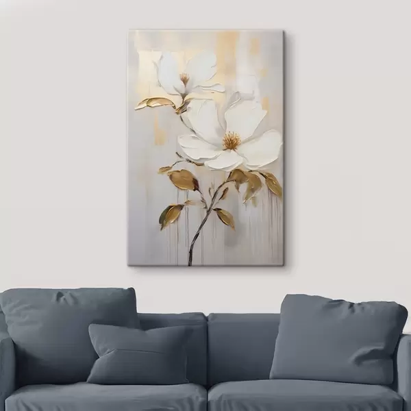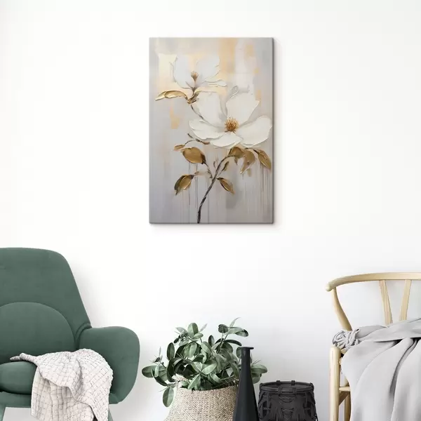 Wandbilder Zwei weiße Blüten mit gelb-orangefarbenen Blättern auf hellem Hintergrund Art. s45691