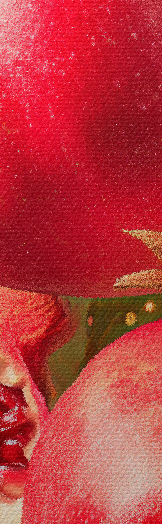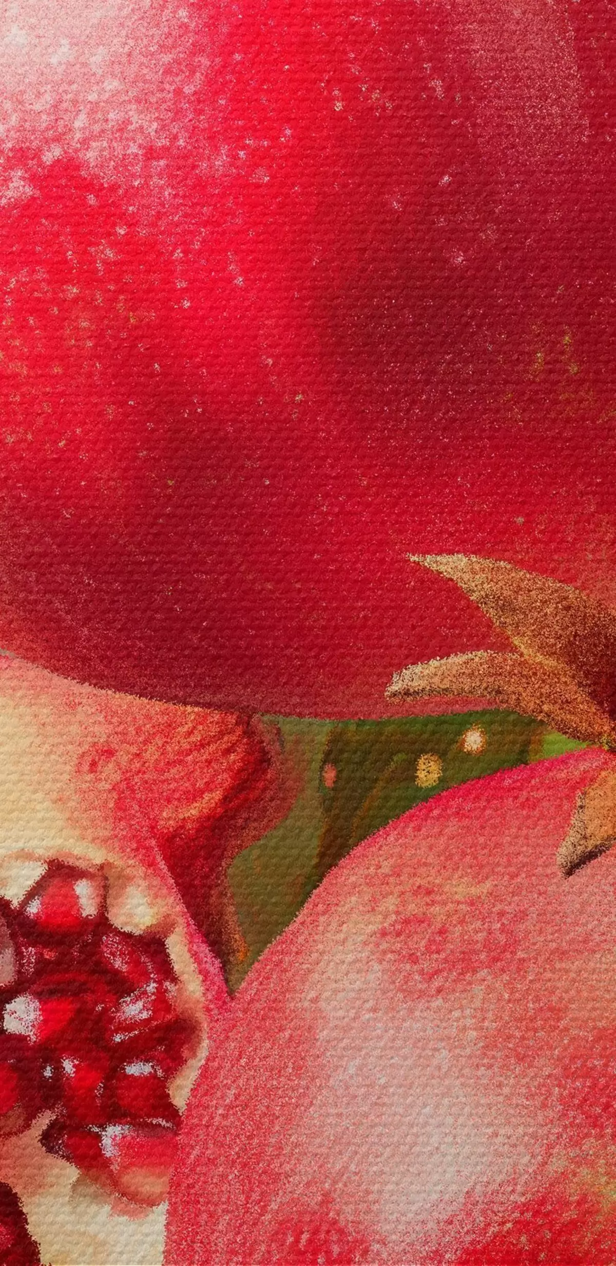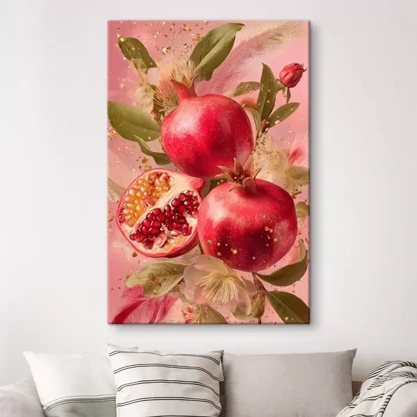 Wandbilder Reife Granatäpfel auf rosa Hintergrund mit Blättern und Flecken s45868