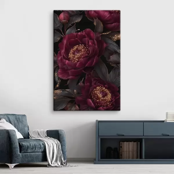 Wandbilder Burgunderrote Pfingstrosen auf schwarzem Hintergrund mit gelben Akzenten s45877