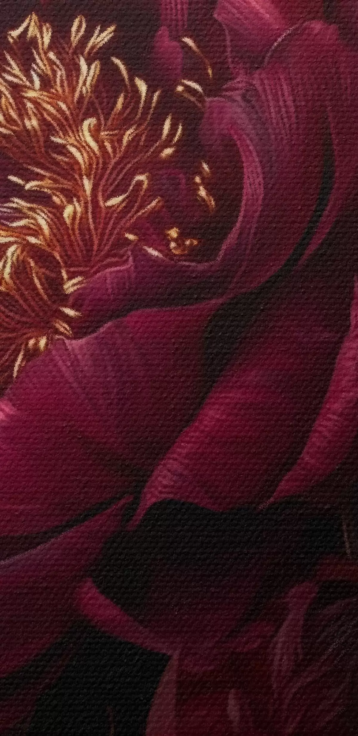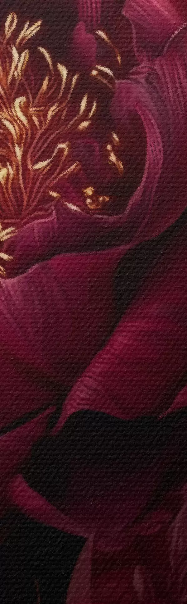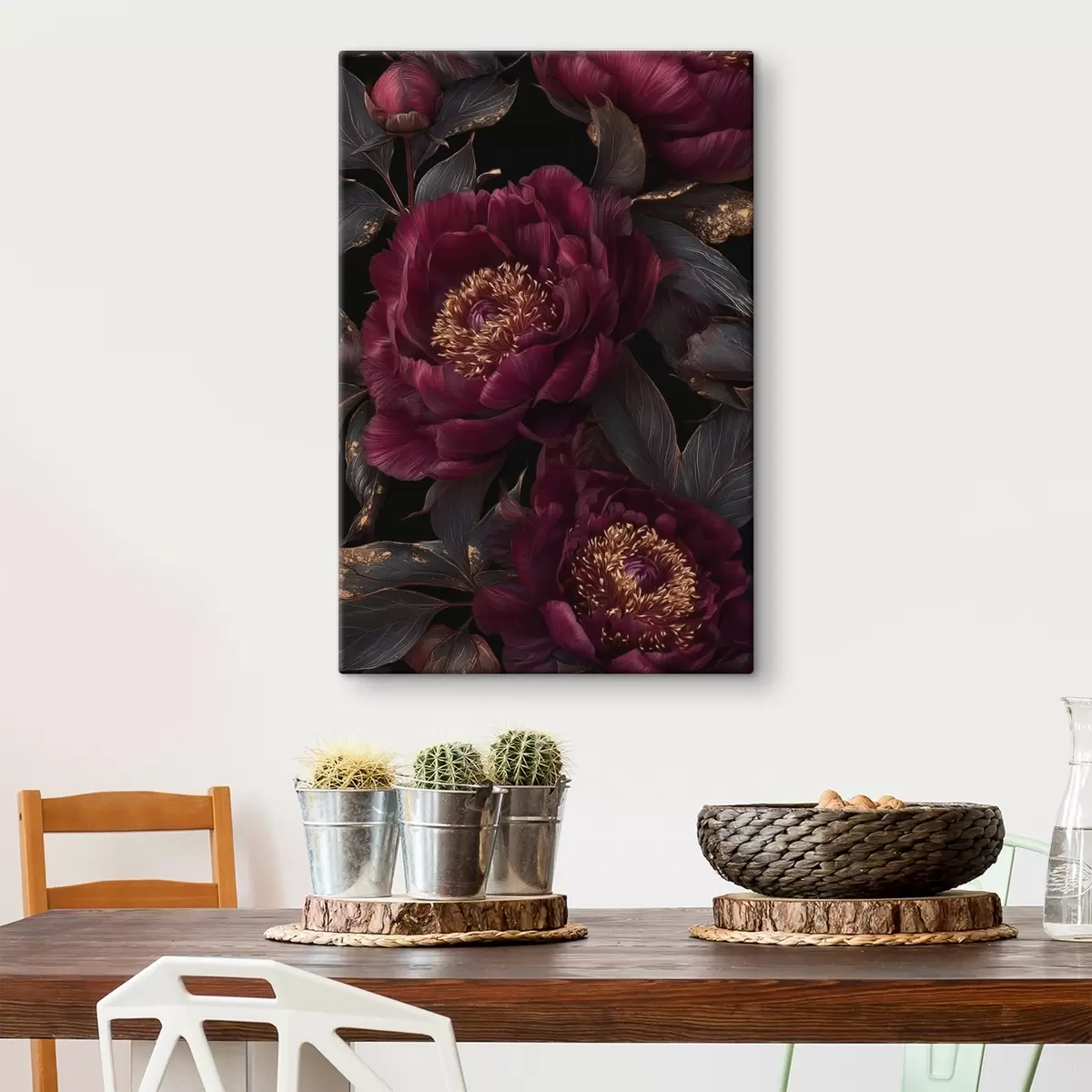 Wandbilder Burgunderrote Pfingstrosen auf schwarzem Hintergrund mit gelben Akzenten Art. s45877