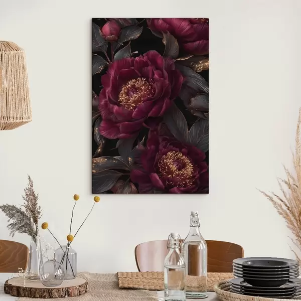 Wandbilder Burgunderrote Pfingstrosen auf schwarzem Hintergrund mit gelben Akzenten s45877