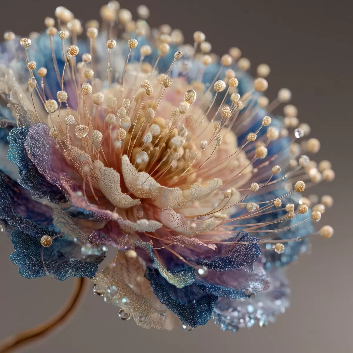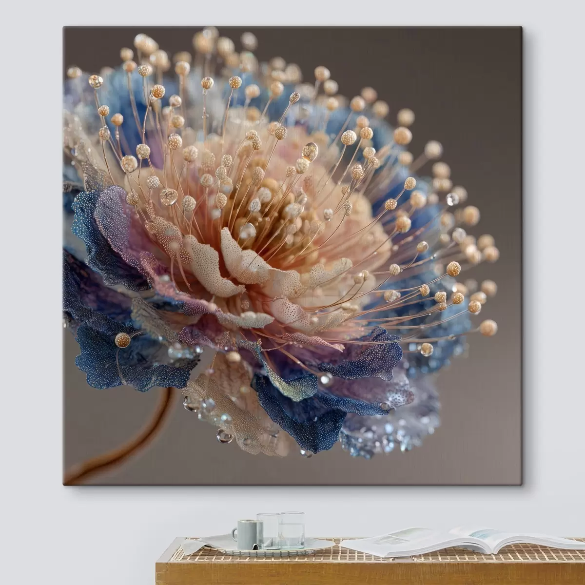 Wandbilder Perlmuttfarbene Blume mit Tautropfen, pfirsich- und blaue Blütenblätter Art. s45911