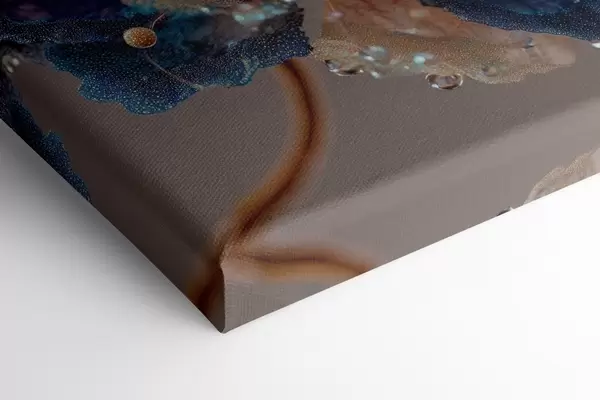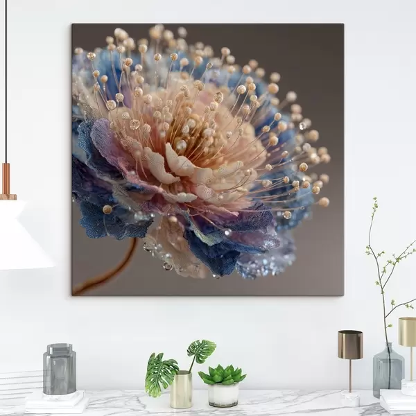 Wandbilder Perlmuttfarbene Blume mit Tautropfen, pfirsich- und blaue Blütenblätter Art. s45911