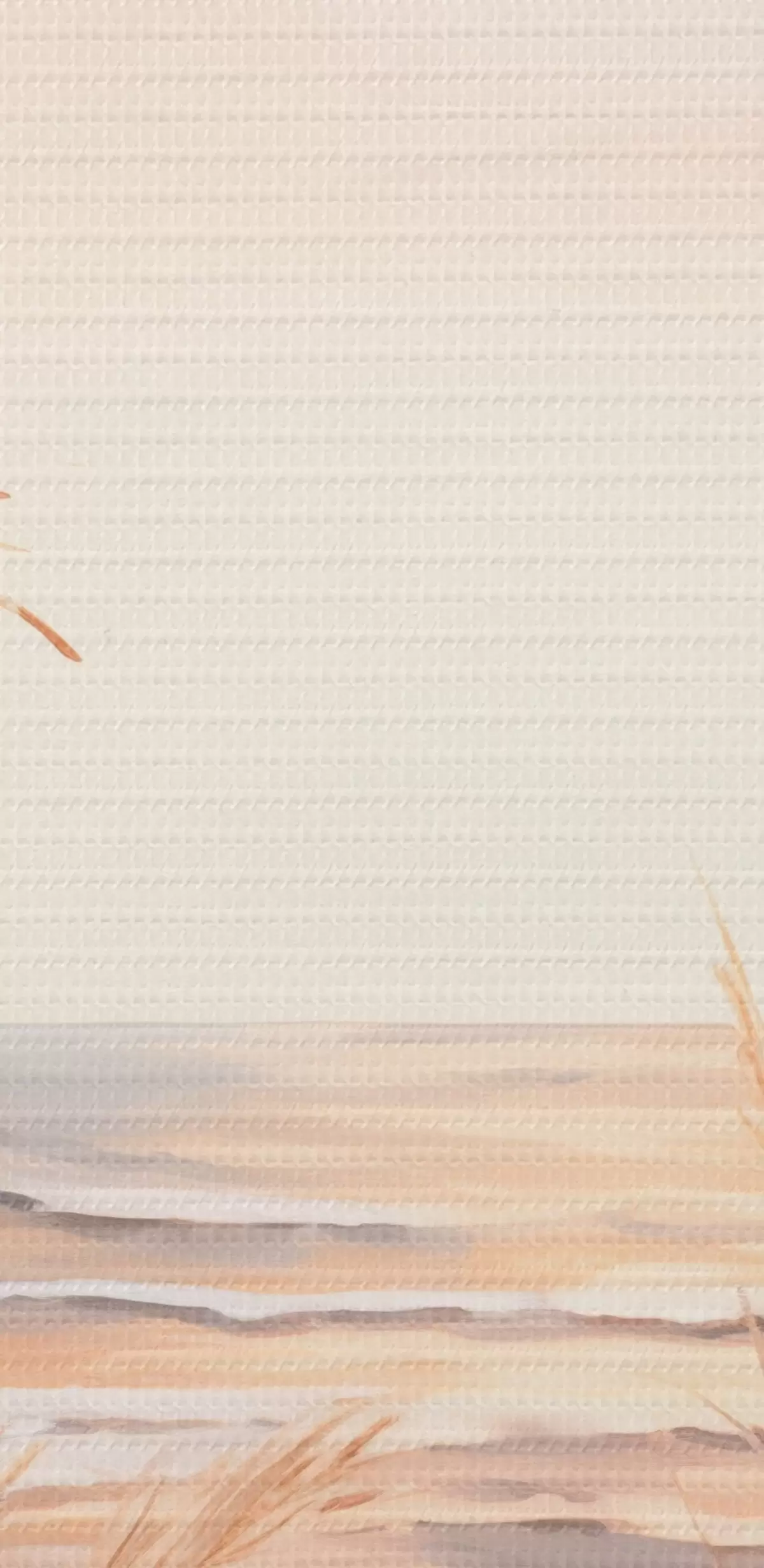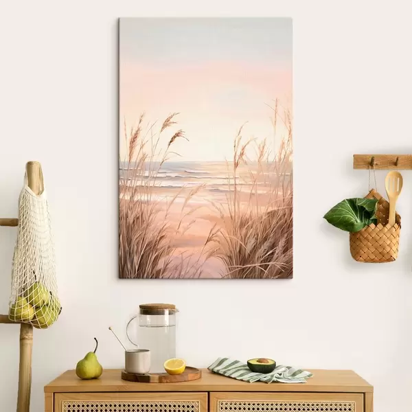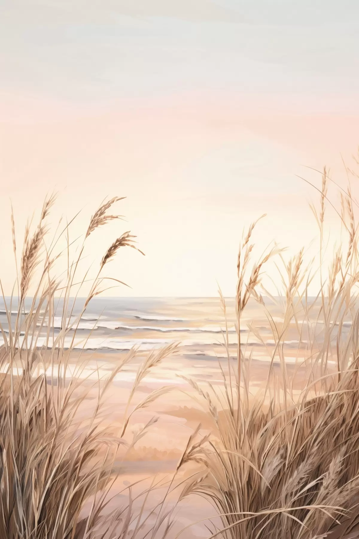 Wandbilder Pampasgras mit pastelloranger Farbpalette, hellrosa Himmel, eine ruhige Landschaft s45935