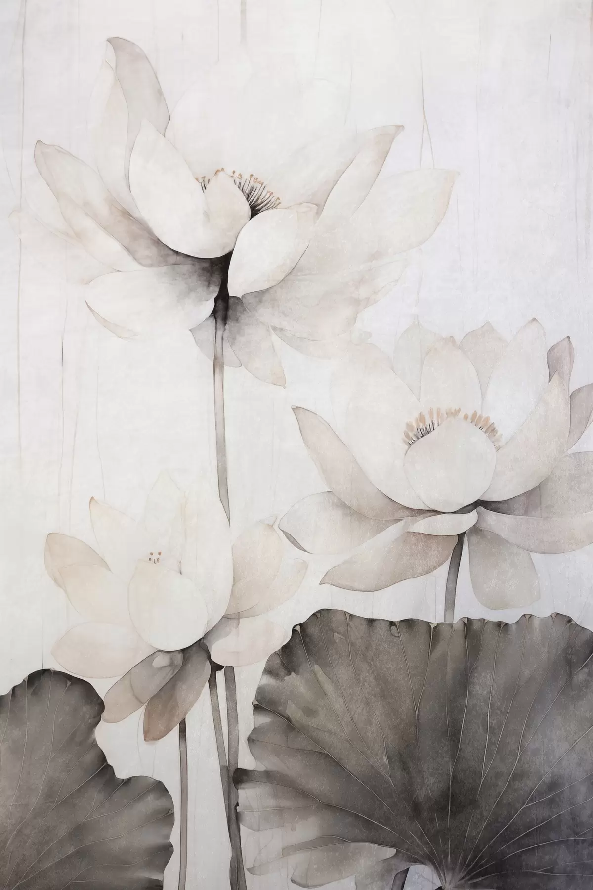 Wandbilder Weiße Lotusblumen mit dunkler Blattstruktur, heller Hintergrund, minimalistisches Design s45936