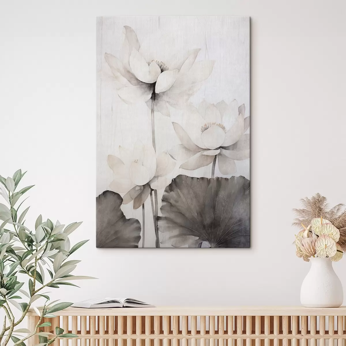 Wandbilder Weiße Lotusblumen mit dunkler Blattstruktur, heller Hintergrund, minimalistisches Design Art. s45936