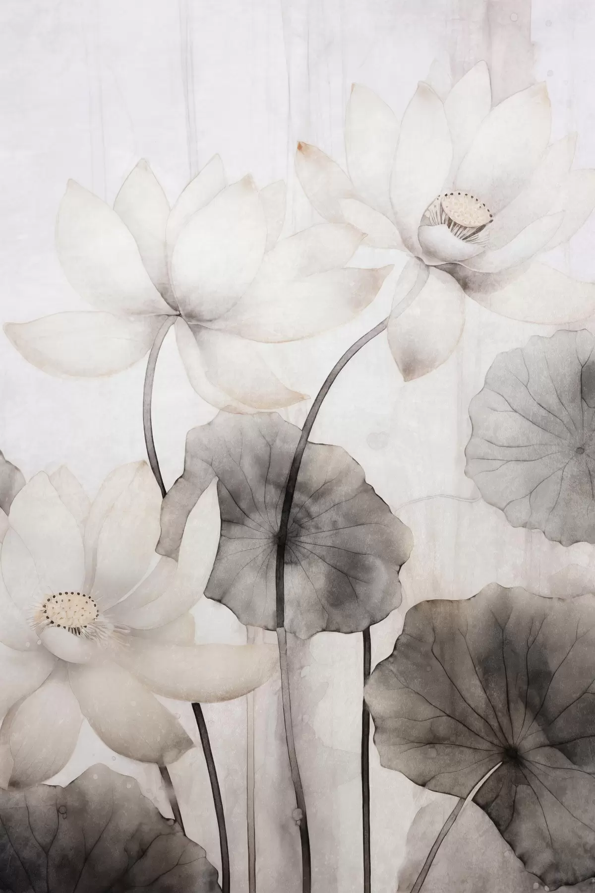 Wandbilder Weiße Lotusblumen mit dunkler Blattstruktur, heller Hintergrund, minimalistisches Design s45937