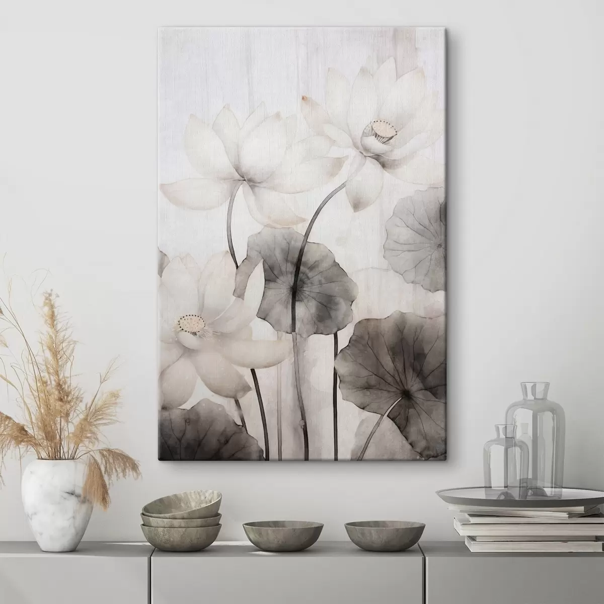 Wandbilder Weiße Lotusblumen mit dunkler Blattstruktur, heller Hintergrund, minimalistisches Design Art. s45937
