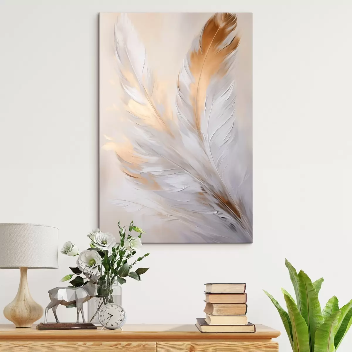 Wandbilder Federn mit orangefarbenen Akzenten, sanfte Beleuchtung, strukturierte minimalistische Komposition, moderne Kunst s45944