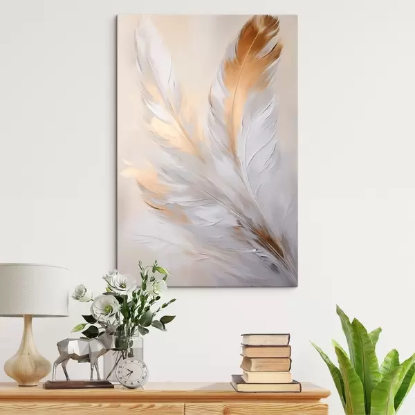 Wandbilder Federn mit orangefarbenen Akzenten, sanfte Beleuchtung, strukturierte minimalistische Komposition, moderne Kunst Art. s45944